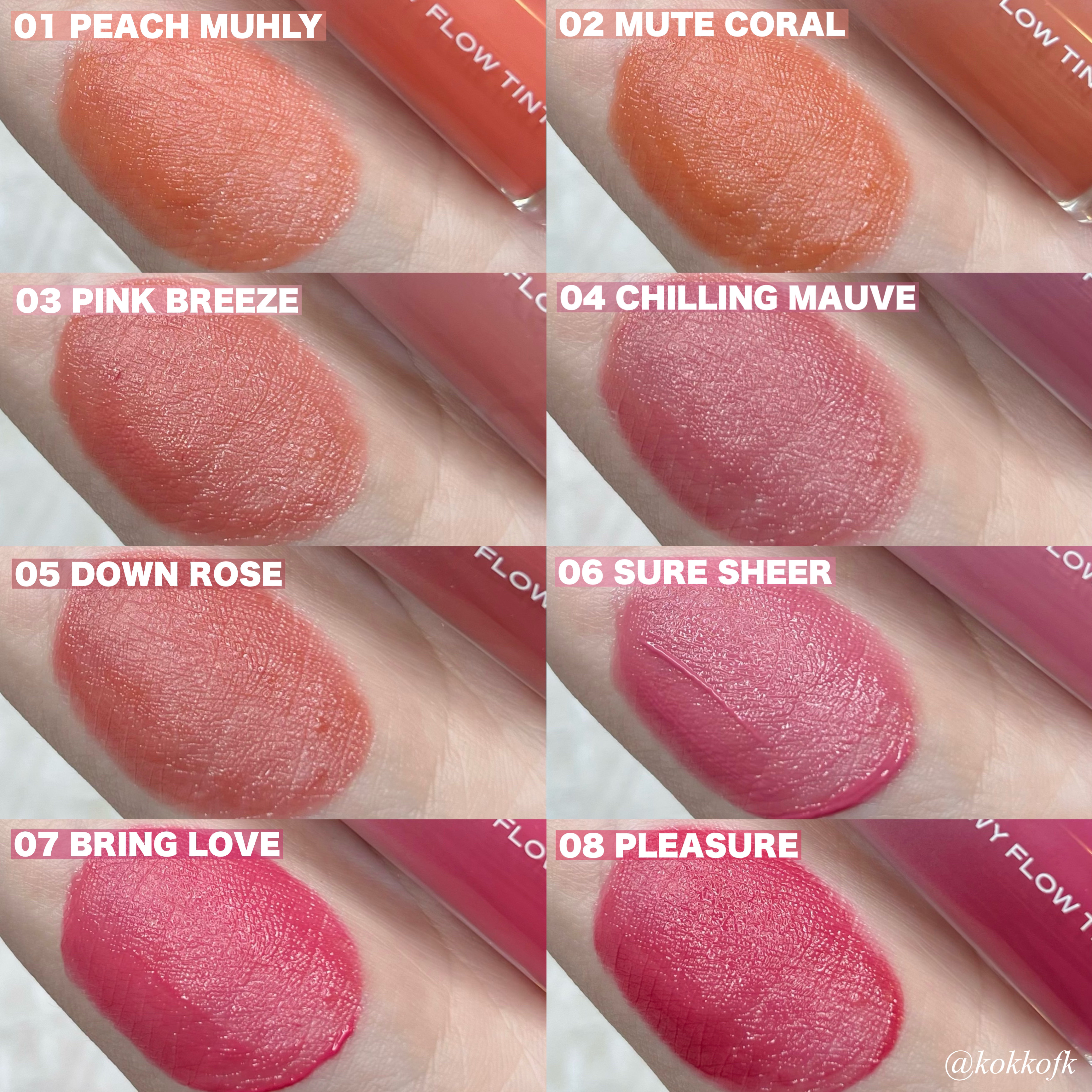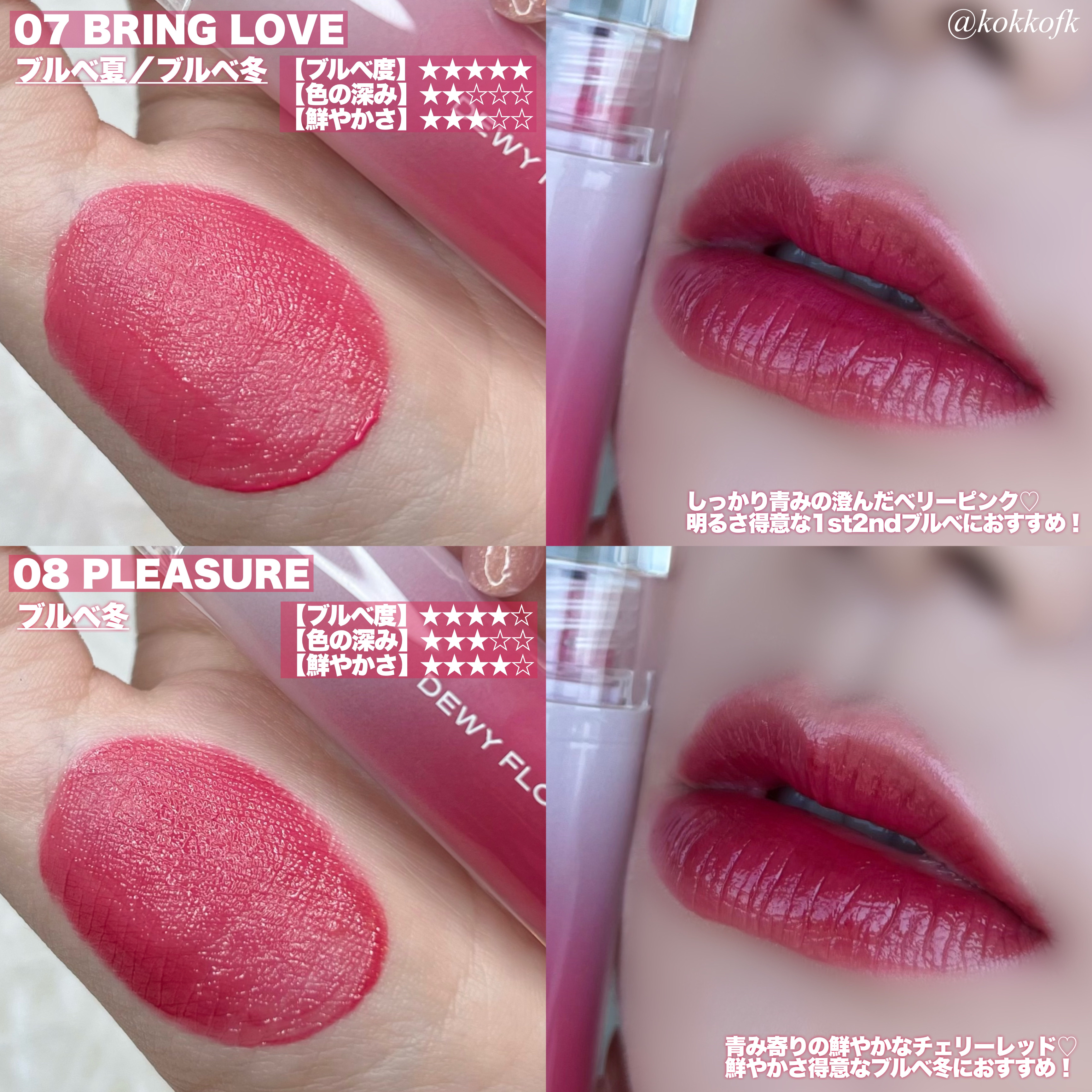 既存のジューシーラスティングティントよりさらに軽いツヤ感が魅力の新作ティント! 色選びの参考にしてね! やや黄みの明るいオレンジコーラル鮮やか得意なイエベ春におすすめ! 黄みの明るくまろやかなオレンジベージュ黄みが得意なイエベ春におすすめ! 青み黄み中間なくすみピンクベージュブルベ夏やイエベ春におすすめ 黄みの深くて鮮やかなオレンジレッド鮮やか得意なイエベ秋におすすめ! 青みの鮮やかで明るいビビッドピンク明るさ得意なブルベ冬やブルベ夏におすすめ! 青みの明るめで柔らかいローズピンクブルベ夏やブルベ冬におすすめ! 青み黄み中間な鮮やかで強いビビッドレッド2ndイエベ春のブルベ冬におすすめ! 青みの強い深くて鮮やかなベリーレッド2nd夏で鮮やか得意なブルベ冬におすすめ!