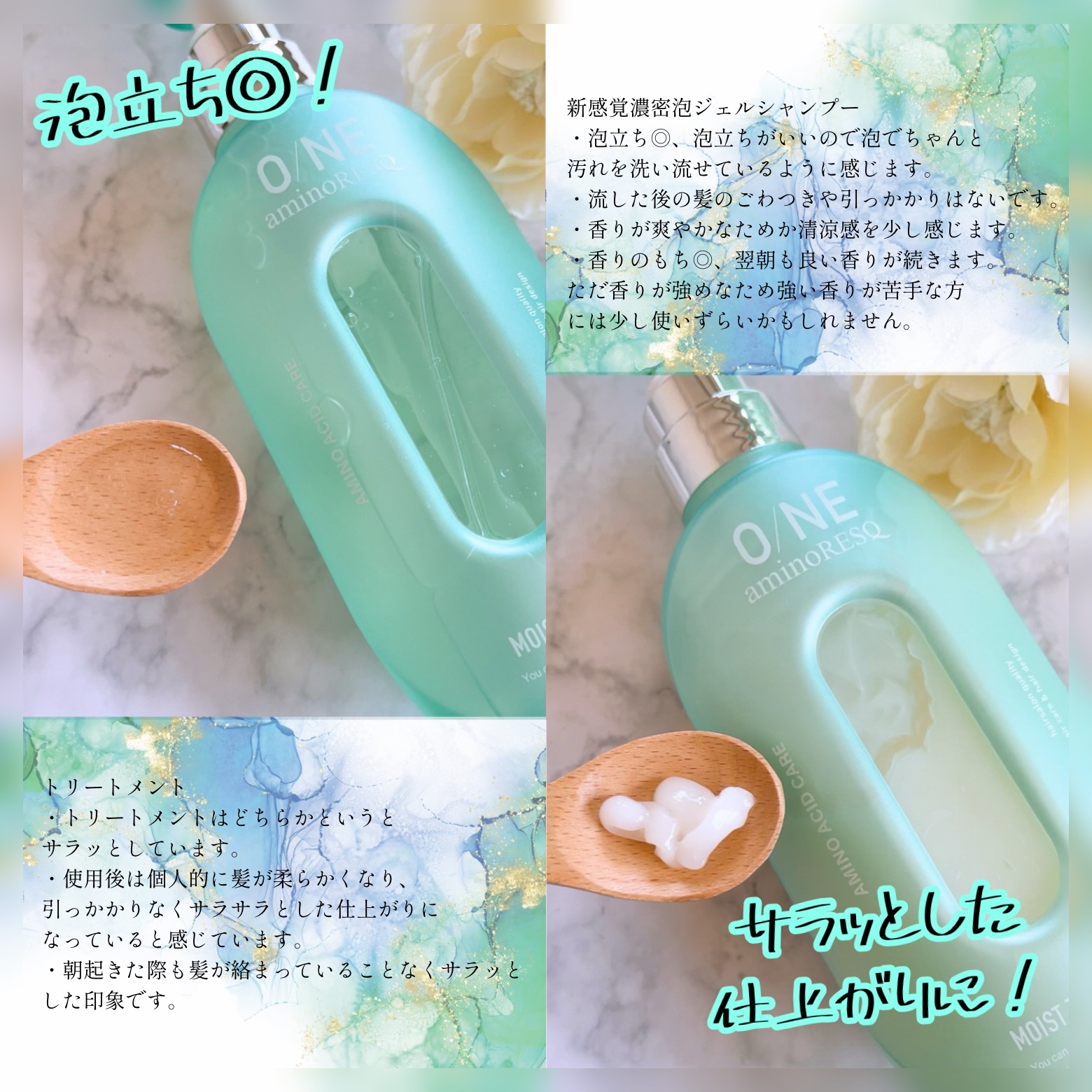 使いきり!アミノレスキューのワンアミノレスキューモイストシャンプー/トリートメント!︎︎︎︎モイストシャンプーは新感覚濃密泡ジェルシャンプーで︎︎︎︎ダメージを受けた髪もしっとり補修してくれる。私はブリーチしているので髪の毛の乾燥が半端ないの...