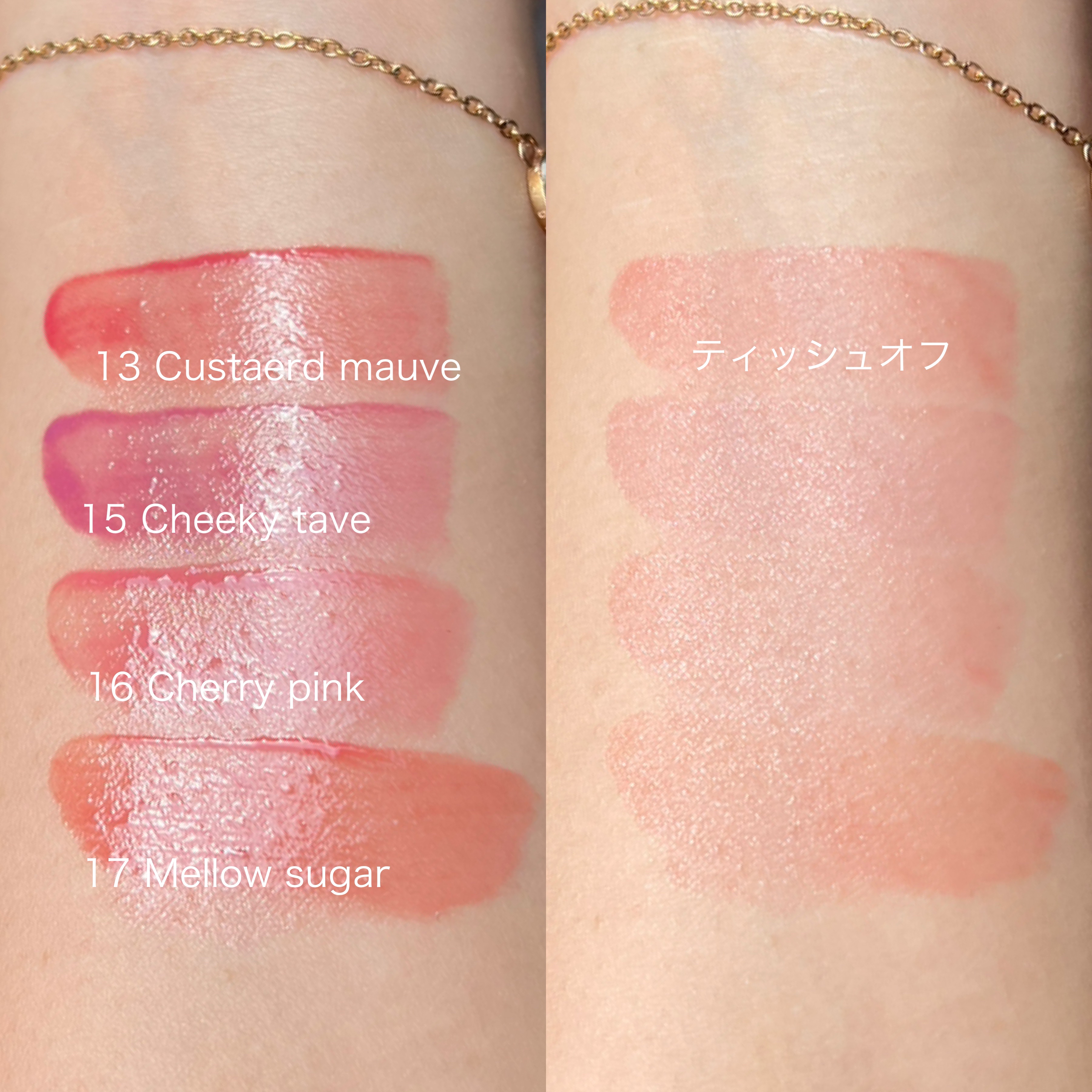 - <01 インコーラル> 水、ビスジグリセリルポリアシルアジペート-2、グリセリン、ジフェニルジメチコン、ジフェニルシロキシフェニルトリメチコン、ポリグリセリン-3、リンゴ酸ジイソステアリル、水添ポリイソブテン、ポリブテン、トリメチルシロキシフェニルジメチコン、変性アルコール、ポリソルベート60、イソノナン酸イソノニル、ペンチレングリコール、(アクリル酸ヒドロキシエチル/アクリロイルジメチルタウリンNa)コポ リマー、ラベンダーエキス、ハナハッカ花/葉/茎エキス、ローズマリーエキス、タイムエキス、ステアリン酸グリセリル、ステアリン酸PEG-100、スクワラン、ラウリルPEG-10トリス(トリメチルシロキシ)シリルエチルジメチコン、エチルヘキシルグリセリン、デキストリン、ステビオシド、イソステアリン酸ソルビタン、エチレンジアミンジコハク酸3Na、水酸化Al、ポリアクリル酸アンモニウム、BG、トコフェロール、フェノキシエタノール、香料、リモネン、酸化チタン、黄5、赤227、黄4、青1 <03 イフローズ> 水、ビスジグリセリルポリアシルアジペート-2、グリセリン、ジフェニルジメチコン、ジフェニルシロキシフェニルトリメチコン、ポリグリセリン-3、リンゴ酸ジイソステアリル、水添ポリイソブテン、ポリブテン、トリメチルシロキシフェニルジメチコン、変性アルコール、ポリソルベート60、イソノナン酸イソノニル、ペンチレングリコール、(アクリル酸ヒドロキシエチル/アクリロイルジメチルタウリンNa)コポリマー、ラベンダーエキス、ハナハッカ花/葉/茎エキス、ローズマリーエキス、タイムエキス、ステアリン酸グリセリル、ステアリン酸PEG-100、スクワラン、ラウリルPEG-10トリス(トリメチルシロキシ)シリルエチルジメチコン、エチルヘキシルグリセリン、デキストリン、ステビオシド、トリイソステアリン酸ポリグリセリル-2、イソステアリン酸ソルビタン、エチレンジアミンジコハク酸3Na、水酸化Al、ポリアクリル酸アンモニウム、BG、トコフェロール、フェノキシエタノール、香料、リモネン、酸化チタン、黄5、赤227、青1、黄4、赤218 <04 チリアップ> 水、ビスジグリセリルポリアシルアジペート-2、グリセリン、ジフェニルジメチコン、ジフェニルシロキシフェニルトリメチコン、ポリグリセリン-3、リンゴ酸ジイソステアリル、水添ポリイソブテン、ポリブテン、トリメチルシロキシフェニルジメチコン、変性アルコール、ポリソルベート60、イソノナン酸イソノニル、ペンチレングリコール、(アクリル酸ヒドロキシエチル/アクリロイルジメチルタウリンNa)コポ リマー、ラベンダーエキス、ハナハッカ花/葉/茎エキス、ローズマリーエキス、タイムエキス、ステアリン酸グリセリル、ステアリン酸PEG-100、スクワラン、ラウリルPEG-10トリス(トリメチルシロキシ)シリルエチルジメチコン、エチルヘキシルグリセリン、デキストリン、ステビオシド、イソステアリン酸ソルビタン、エチレンジアミンジコハク酸3Na、トコフェロール、BG、フェノキシエタノール、料、リモネン、黄5、赤227、黄4、青1 <06 チュリアン> 水、ビスジグリセリルポリアシルアジペート-2、グリセリン、ジフェニルジメチコン、ジフェニルシロキシフェニルトリメチコン、ポリグリセリン-3、リンゴ酸ジイソステアリル、水添ポリイソブテン、ポリブテン、トリメチルシロキシフェニルジメチコン、変性アルコール、ポリソルベート60、イソノナン酸イソノニル、ペンチレングリコール、(アクリル酸ヒドロキシエチル/アクリロイルジメチルタウリンNa)コポリマー、ラベンダーエキス、ハナハッカ花/葉/茎エキス、ローズマリーエキス、タイムエキス、ステアリン酸グリセリル、ステアリン酸PEG-100、スクワラン、ラウリルPEG-10トリス(トリメチルシロキシ)シリルエチルジメチコン、エチルヘキシルグリセリン、デキストリン、ステビオシド、イソステアリン酸ソルビタン、エチレンジアミンジコハク酸3Na、水酸化Al、ポリアクリル酸アンモニウム、BG、トコフェロール、フェノキシエタノール、香料、リモネン、酸化チタン、黄5、赤227、酸化鉄、黄4、赤218、青1 <08 ベリーディヴァイン> 水、ビスジグリセリルポリアシルアジペート-2、グリセリン、ジフェニルジメチコン、ジフェニルシロキシフェニルトリメチコン、ポリグリセリン-3、リンゴ酸ジイソステアリル、水添ポリイソブテン、ポリブテン、トリメチルシロキシフェニルジメチコン、変性アルコール、ポリソルベート60、イソノナン酸イソノニル、ペンチレングリコール、(アクリル酸ヒドロキシエチル/アクリロイルジメチルタウリンNa)コポリマー、ラベンダーエキス、ハナハッカ花/葉/茎エキス、ローズマリーエキス、タイムエキス、ステアリン酸グリセリル、ステアリン酸PEG-100、スクワラン、ラウリルPEG-10トリス(トリメチルシロキシ)シリルエチルジメチコン、エチルヘキシルグリセリン、イソステアリン酸ソルビタン、デキストリン、ステビオシド、エチレンジアミン