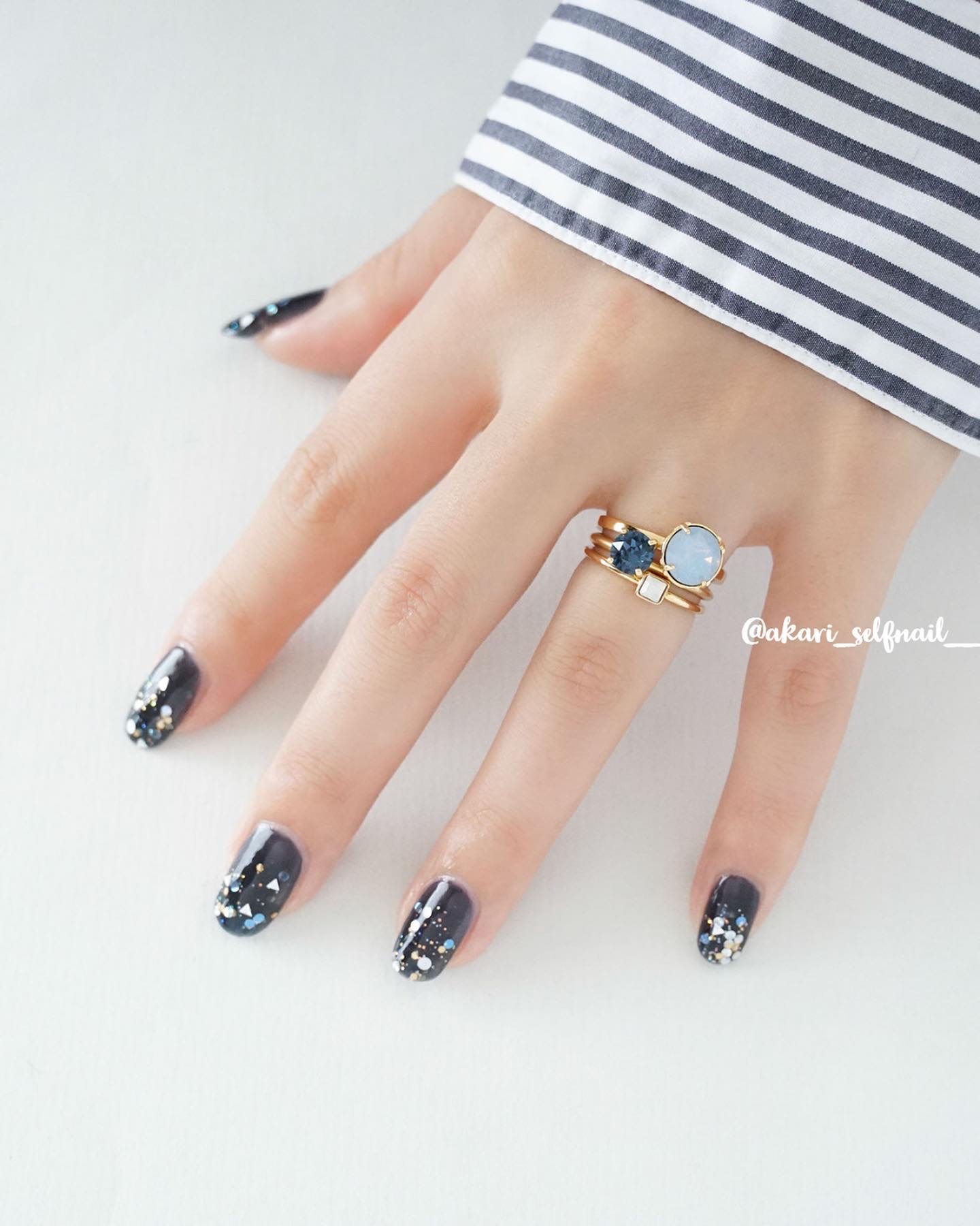 ベースにフレークをふぁさっと乗せて乾かしたら 2色をランダムに塗り重ねるだけ。 シアーだからぼかし不要で ニュアンスっぽくなるのありがたい…🥹 室内でも外でもずっと眺めていられるような 美しいカラーでした✨ 色味もラメ感も好きすぎる💙