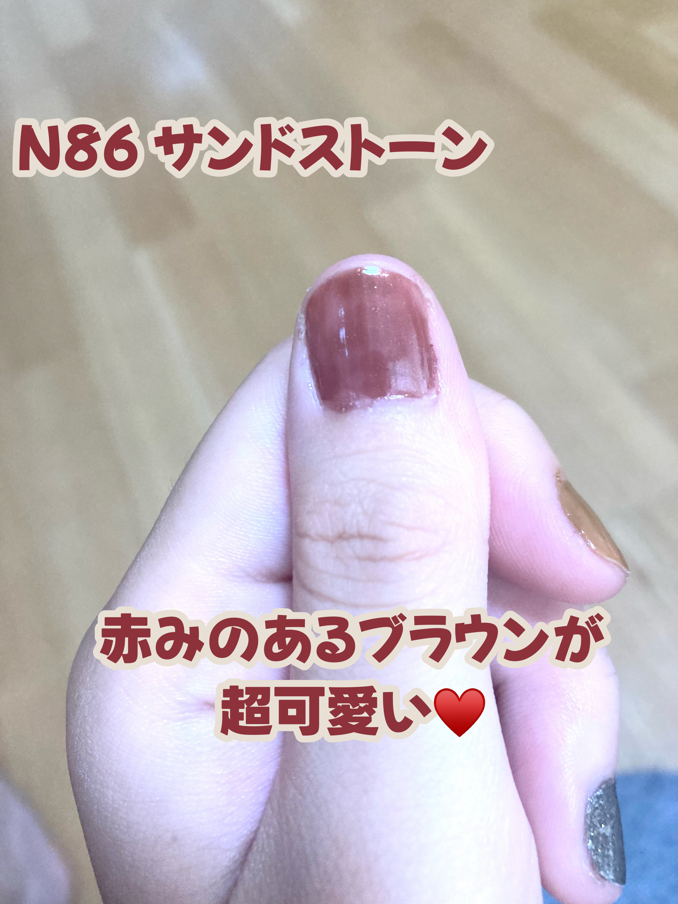 黄味がかったラメが入っていて、光の辺り具合でキラキラするから可愛い♥️ ブラウンっぽい色味で、秋や冬に塗りたくなるカラー イエベさんに特におすすめ✨ 乾くのが早い!