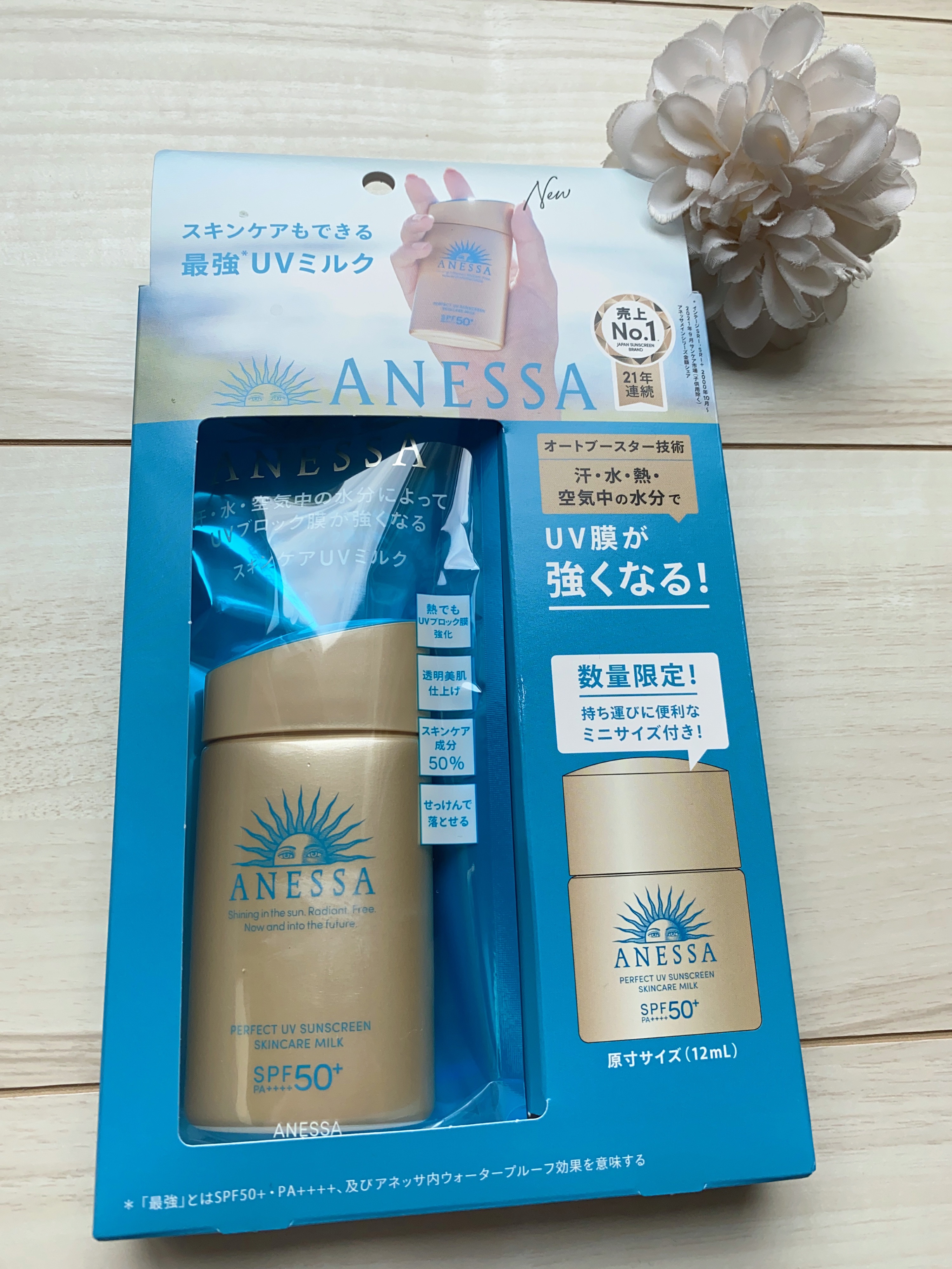 - 顔・からだ用 SPF50+ ・ PA++++ 汗、水、熱、そして空気中の水分に反応してUVブロック膜が強くなる技術搭載 最強※8 UVスキンケアミルク ※8 「最強」とはSPF50+・PA++++、及びアネッサ内ウォータープルーフ効果を意味する。 〇汗・水・熱、そして空気中の水分に自動的に反応して、UVブロック膜が強くなります。-オートブースター技術 〇透明美肌仕上げ-ビューティーアップ効果 “ビューティーアップ粉末”を新配合透明感のある美しいつや肌へ ○スキ ン ケア成 分 50% 配合 〇植物由来成分をブレンドした、紫外線による 乾燥 ダメージを防 ぐ 、うるおいを与える保湿美肌成分 黄花エキス、緑茶エキス、異性化糖、グリセリン 〇保湿 成分 コラーゲン、 スーパーヒアルロン酸※ 9 、 グリセリン ※9 アセチルヒアルロン 酸 Na 〇保湿持続 効果 ○スーパーウォータープルーフ 〇マスク蒸れ対応 〇耐こすれ ○化粧下地効果 ○せっけんで落とせ る 〇さらさらミルク ○生まれ変わった 、 心地よいフルーティーフローラルの香り 〇大気中に浮遊する微粒子、 PM2 .5 などから肌を保護 し ま す。-微粒子付着防止対応 ○砂が肌 につきにくいサンドプルーフ効果 〇海に流れ出にくいオーシャンフレンドリー処方※6 ※6 自社品内の耐水処方でない商品と比較 ○環境に優しいサステナブルなボトル ○植物由来の原料を一部使用した袋 〇オキシベンゾン 、 オクチノキサート無配合 ○無着色・ ノンコメドジェニックテスト・ アレルギーテスト済み (全ての方にニキビができない、アレルギ ーが起きないというわ けではありません)