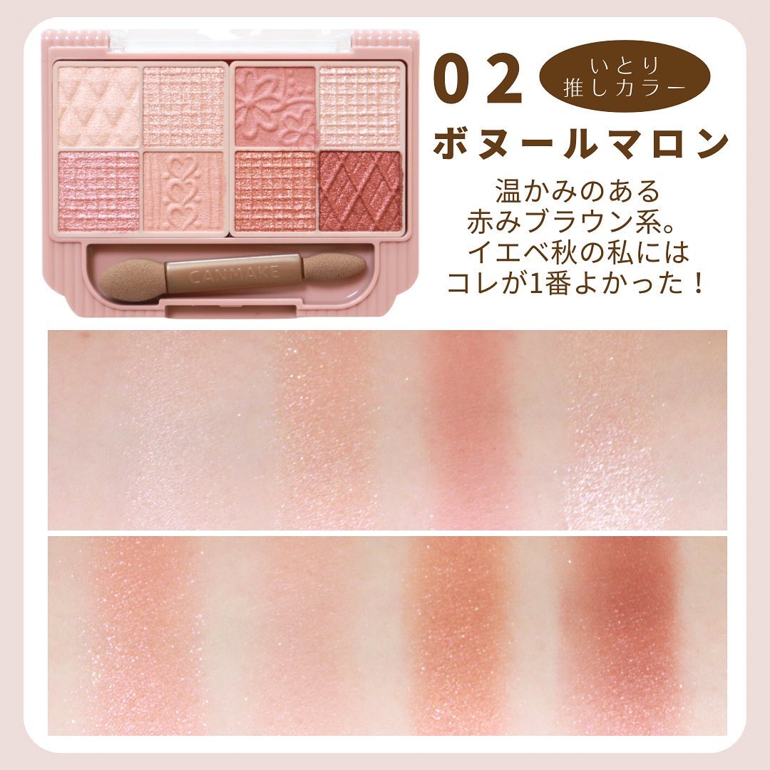 - 持ち歩ける多色パレットがキャンメイクから登場! 捨て色なしの8色入り&チップ付! 「持ち歩けること」や「外出先でもメイク直しができること」を重視した多色パレット。 持ち運びやすいサイズ感なのに、贅沢に8色入りです。 さらに便利なダブルエンドチップまで! マット×パール×ラメなど、組み合わせ方はあなたの自由! 自分好みのアイメイクを楽しめます。