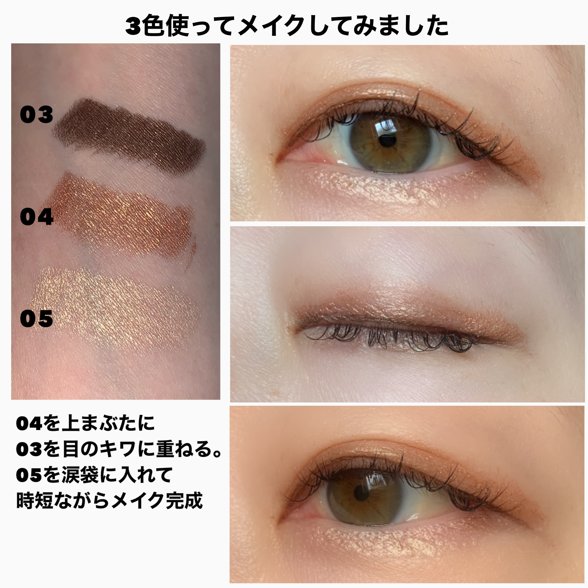 気になってたアイグロウ ジェムを初めて購入しました♡容量6gという事ですが横から見ると高さが割とあり意外と多いなという印象。 触ってみるとプニプニしてるなんとも言えない感触‼︎不思議〜 指で伸ばしてみるとスルスル伸びる。ベースにもピッタリ。クリームシャドウはよれにくい印象ですがこちらは時間が経ってもよれにくい‼︎ 単色アイシャドウとしてはもちろんこれ一つでグラデーションも作れます‼︎ この上に色を重ねても綺麗にでるのでベースとしても◎ラメもマットも合わせやすいです! お色は全39種類。なかなか選べないと思いますが他の色も欲しくなりました! また公式オンラインでは刻印サービス、ラッピングサービスもありますのでプレゼントにも喜ばれると思います♡