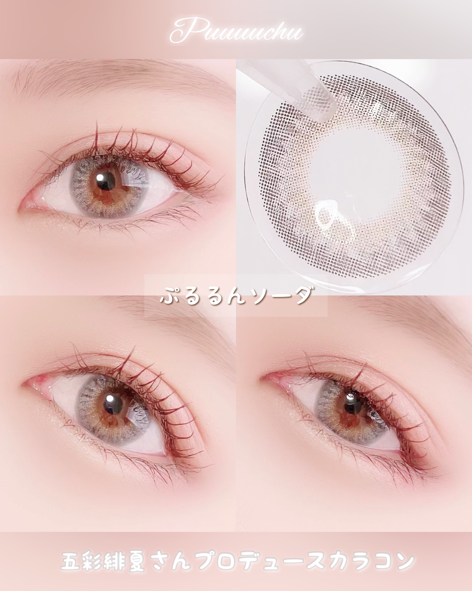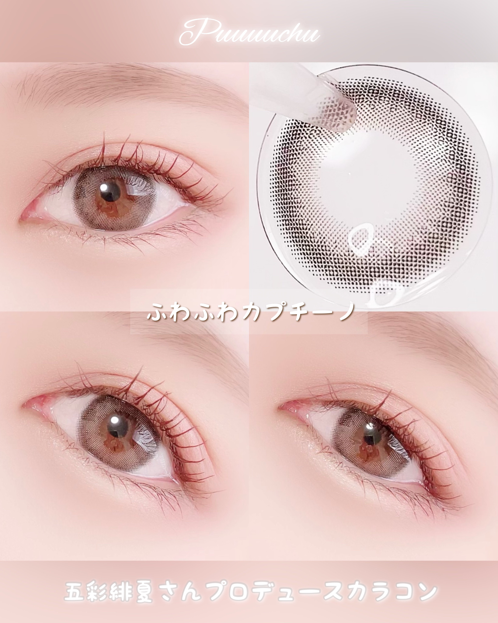 - ※2023年7月よりパッケージ底面カラー名表記部分、順次リニューアル。尚、これに係る商品の返品・交換等は承っておりません。 女の子の「かわいい」がぜーんぶ叶うよくばりなラインナップ 絶対ばぶフェイス♡ちゅるんチョコフラッペ DIA14.2mm/着色直径13.5mm 細フチ×ピュアベージュ ピュアちゅるんレンズで守りたくなっちゃうような甘めの瞳に 王道人類モテ♡ふわふわカプチーノ DIA14.5mm/着色直径13.7mm ぽんわりフチ×ふわブラウン フチふんわりシフォンブラウンレンズで優し気な瞳に 超絶盛れ地雷女子♡きゅるきゅるダークモカ DIA14.5mm/着色直径13.8mm 溶け込みグラデ×きゅるんブラック くっきり暗めカラーレンズでお人形さんみたいにくっきりとした印象の瞳に 韓国系クール美人♡ぷるるんソーダフロート DIA14.2mm/着色直径13.2mm うるうる質感×透明感ブルー うるうる透明感ブルーグレーレンズでクールビューティーな瞳に 商品名 :PUUUUCHU(プーチュ) 価格 :1,650円 税込(10枚入り) カラー :全4色 レンズ :BC8.6mm DIA14.2mm/14.5mm UVカット 含水率 :38% 使用期間 :終日装用、一日交換 度数 :0.00D(度なし),-0.50D~-6.00D(0.25D刻み),-6.50D~-10.00D(0.50D刻み) 販売名 :ワンデーツッティアルファ 承認番号 :22400BZX00427000 カラーコンタクトレンズの不適正使用による眼障害の危険性等などがあります。 ●コンタクトレンズは高度管理医療機器です。不十分な洗浄・消毒など不適切なケアや、長時間・交換期間を超えた装用により、アレルギー性結膜炎、角膜感染症、角膜潰瘍等の重篤な眼障害が発生する危険性があります ●ご使用前に取扱説明書を確認してください 使用上の留意事項 ●眼科医院等を受診してからお求めください ●眼に異常を感じたら直ちにレンズ使用を中止し、お近くの眼科等で診察を受けてください ●医師の指示にしたがってご使用ください ●コンタクトレンズを装用する場合、自覚症状がなくても、眼科医院等での定期検査を受けてください ●レンズに不具合がある場合は使用しないでください