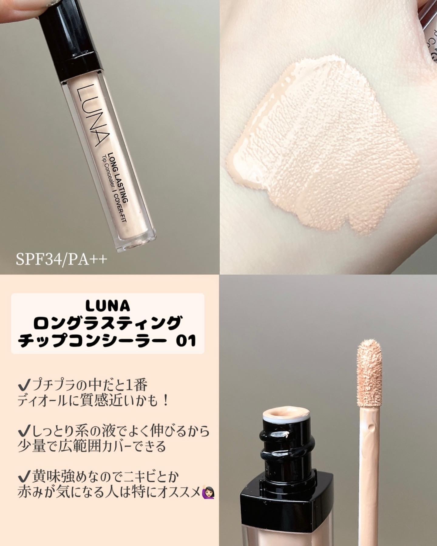 プチプラの中だと1番ディオールに質感近いかも!と思ったLUNA! しっとり系の液でスルスル伸びるから少量で広範囲カバーできるし、カバー力も文句なし! 優秀すぎて言うまでもないけど本当に良い…… かなり伸びるからファンデ並みに広範囲カバーできるし、乾燥しにくいし肌負担無いのにここまでカバー力高いのは圧巻。ツヤも出て光でくすみとかアラ飛ばしてくれる。 国民的コンシーラーはこれでは!? 小さくて軽いから持ち運びしやすいのが本当に良い! チップも小さめで小鼻とかクマ等細かいところカバーするにはこれが最適! プチプラの中だと1番カバー力高め!さすがティルティル。 なんと言ってもリキッド&スティックあるの画期的すぎて、、、 SPF入ってるのも驚き。プチプラのクオリティ超えてる。