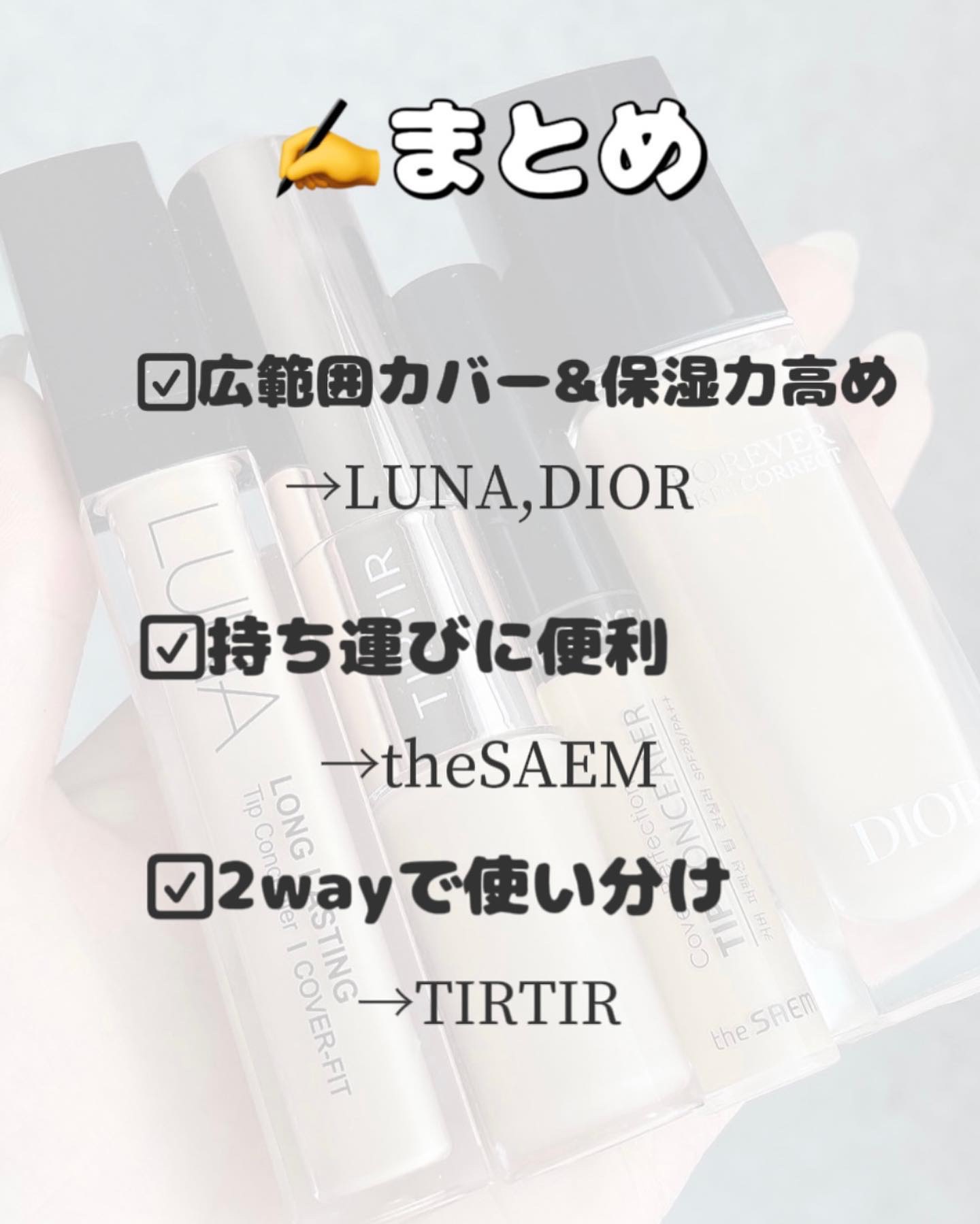 最近買ってよかったのはやっぱりDior!使い心地もカバー力も大満足だった🙆🏻♀️ LUNAも個人的には使用感がDiorに似てて、カバー力もあって乾燥も気にならなかった💭 チップが小さめで細かい部分も付けやすくて好き🥹