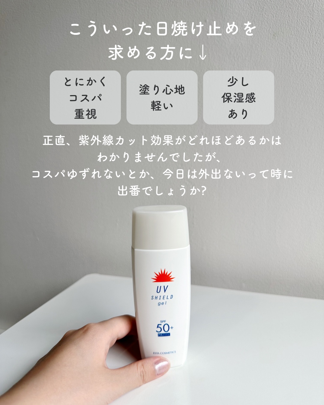 エスタUVシールドジェル顔・からだ用SPF50+PA++++容量100gウォータープルーフドラッグストアでも買えるコスパの良い日焼け止め☀強くこすらなくても、する〜んっと広範囲に伸びる、クリーミーテクスチャー☺️気になるモロモロも出ないし、ナ...