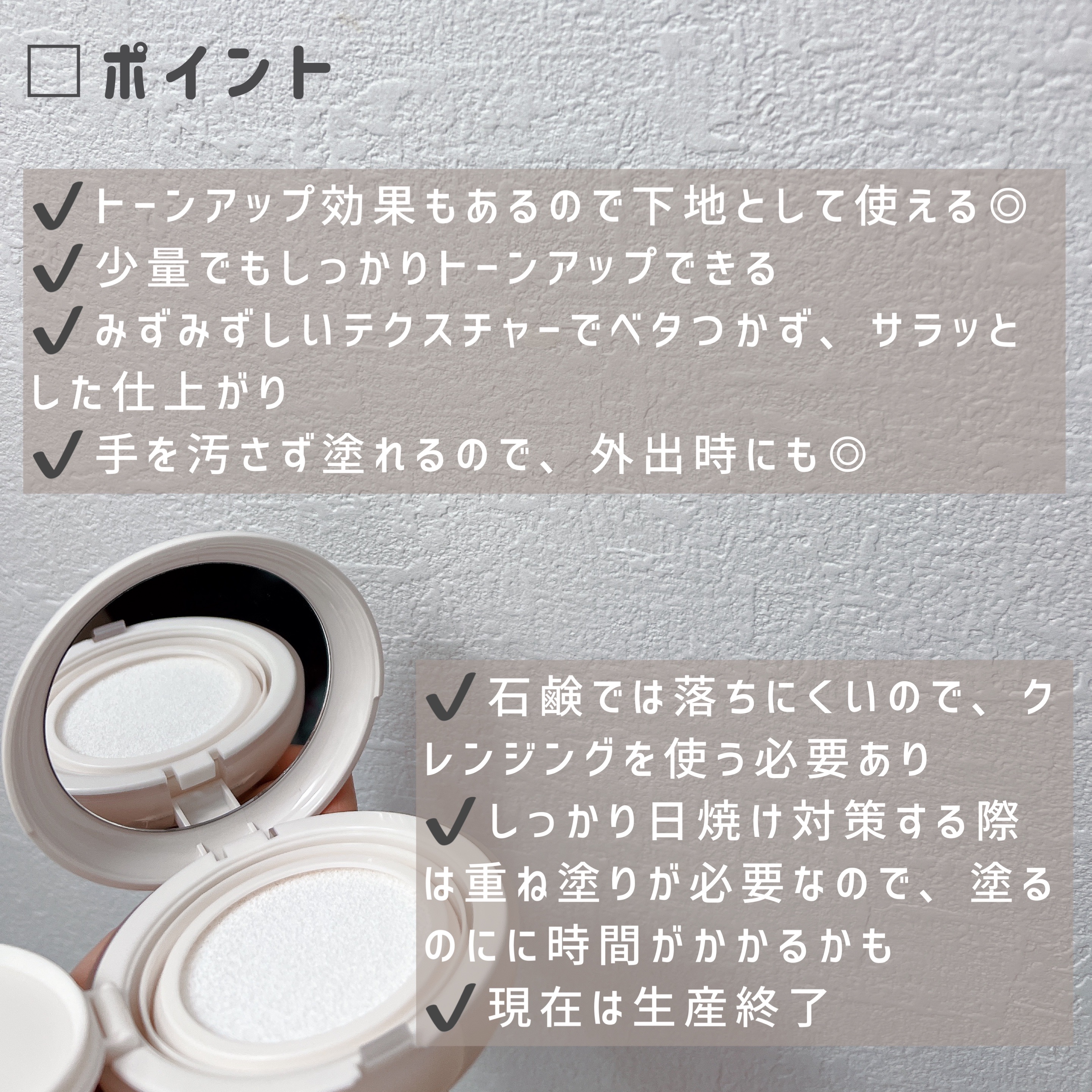 - どこでも手軽に紫外線をカットできるクッションタイプの日やけ止め