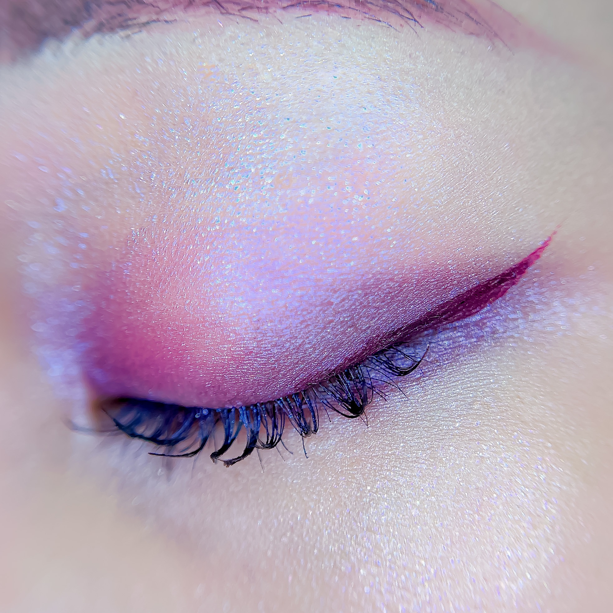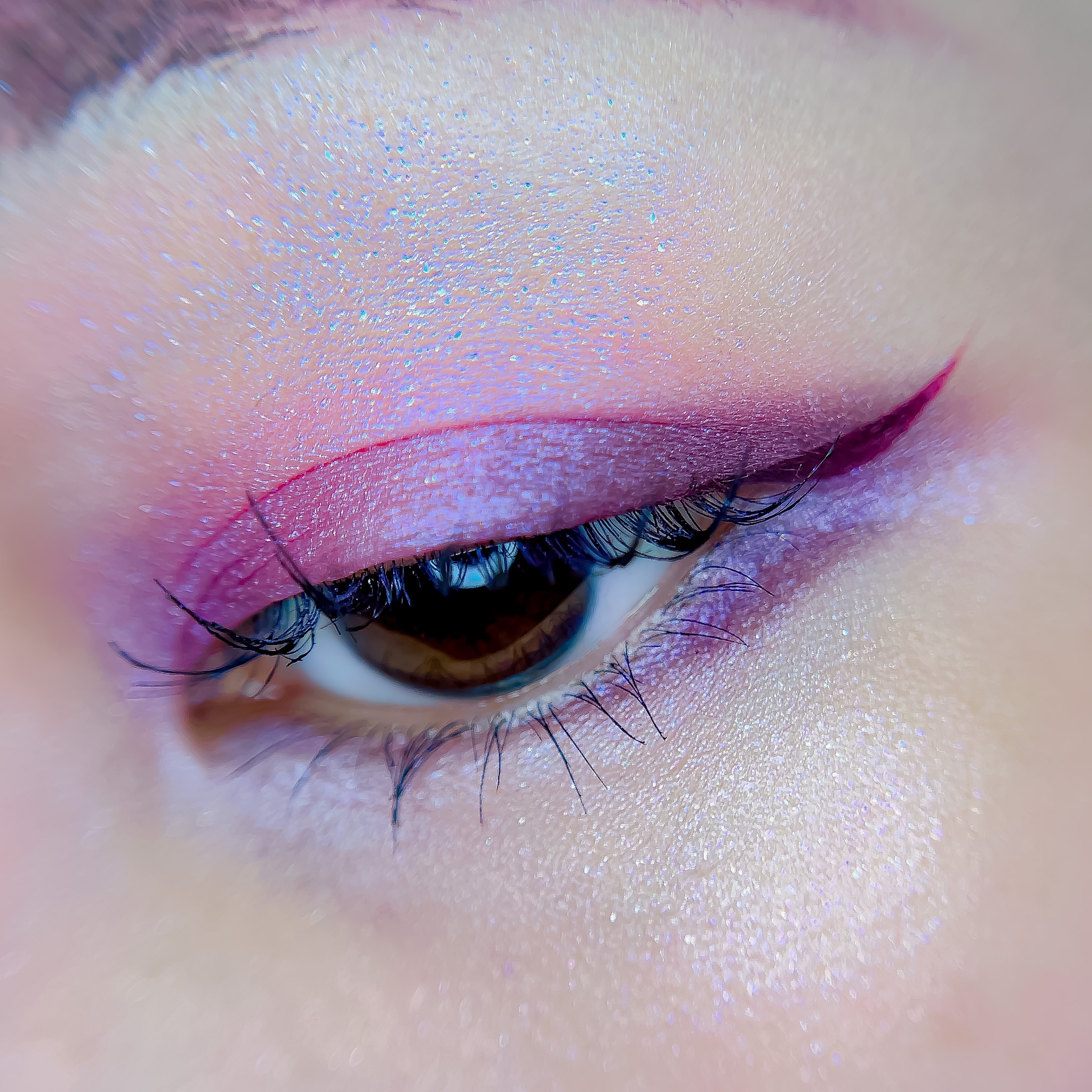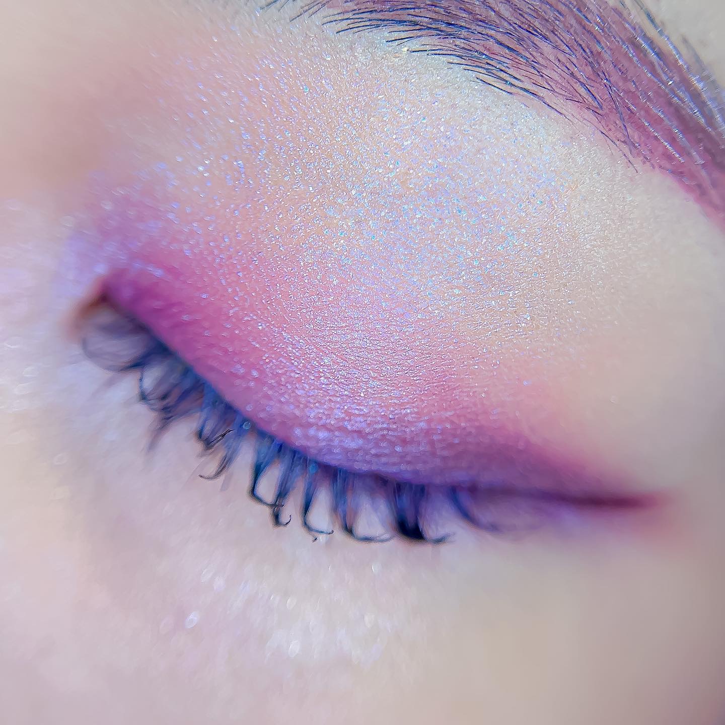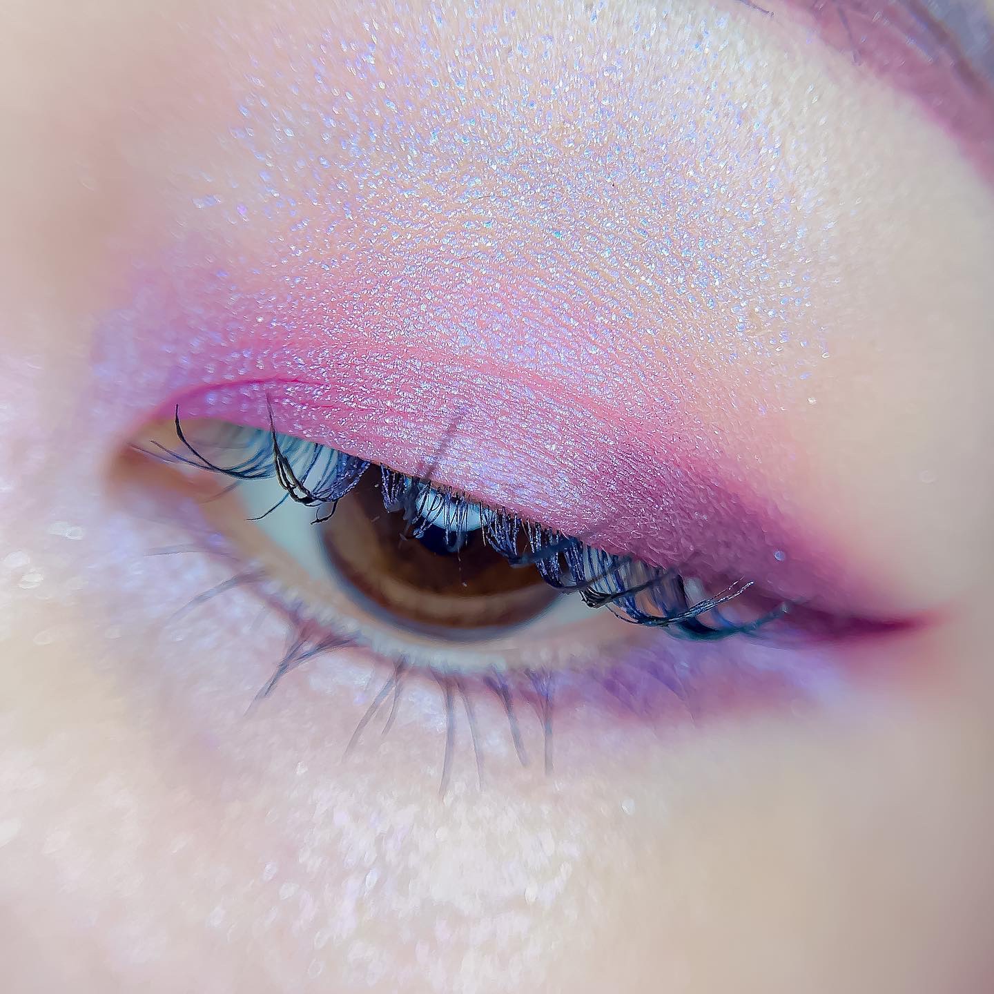 ベースに右上、目頭から黒目上に真ん中、黒目〜目尻に右下を、左上を目頭にくの字に塗ってもらいました✨ ピンクサクラよりもクールな感じで、目で見た色より私の肌では紫っぽく発色しました😍 上2つはラメはぎっしりでときめく💓 ブラウンメイクがとても苦手だけれどこれならブラウンメイク出来そう👌(かなり紫寄りですが) くすみ感は強いので苦手な方は厳しいかも…(特に真ん中) クールな印象になるので大人顔さん向けor大人顔になりたい方向けのイメージです✨
