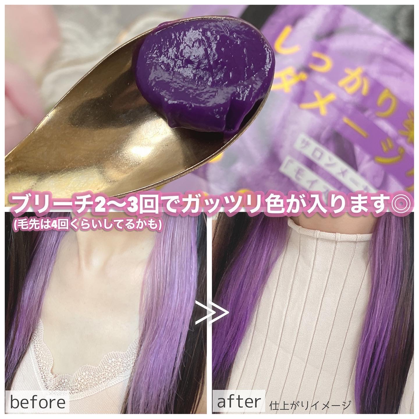 - <シルバー> 水、セテアリルアルコール、グリセリン、セバシン酸ジエチルヘキシル、水添ポリイソブテン、シクロペンタシロキサン、BG、アモジメチコン、ベヘントリモニウムクロリド、ポリクオタニウムー37、加水分解ケラチン(羊毛)、加水分解シルク、加水分解コラーゲン、γードコサラクトン、液状ラノリン、(加水分解シルク/PGプロピルメチルシランジオール)クロスポリマー、アルガニアスピノサ核油、シア脂、ハチミツ、アルギニン、トコフェロール、フィトステロールズ、カプリル酸グリセリル、乳酸、ポリクオタニウムー7、グアーヒドロキシプロピルトリモニウムクロリド、ステアルトリモニウムクロリド、ジステアリルジモニウムクロリド、ステアリン酸グリセリル、塩化Na、ビスセテアリルアモジメチコン、ジメチコン、プロパンジオール、イジプロパノール、エタノール、フェノキシエタノール、安息香酸Na、香料、(+/-)塩基性青99、塩基性茶16、塩基性赤76、塩基性紫2、HC青2 <パープル> 水、グリセリン、セタノール、パルミチン酸エチルヘキシル、ステアリルアルコール、ベヘントリモニウムクロリド、ジメチコン、白金、γ-ドコサラクトン、シア脂、ハチミツ、アルガニアスピノサ核油、フィトステロールズ、アルギニン、乳酸、PEG-90M、アモジメチコン、ステアルトリモニウムクロリド、ポリソルベート80、ジステアリルジモニウムクロリド、プロパンジオール、イソプロパノール、エタノール、フェノキシエタノール、香料、(+/-)塩基性青124、塩基性赤51、塩基性黄57、HC黄4、HC青2、塩基性紫2 <ピンク> 水、グリセリン、セタノール、パルミチン酸エチルヘキシル、ステアリルアルコール、ベヘントリモニウムクロリド、ジメチコン、白金、γ-ドコサラクトン、シア脂、ハチミツ、アルガニアスピノサ核油、フィトステロールズ、アルギニン、乳酸、PEG-90M、アモジメチコン、ステアルトリモニウムクロリド、ポリソルベート80、ジステアリルジモニウムクロリド、プロパンジオール、イソプロパノール、エタノール、フェノキシエタノール、香料、(+/-)塩基性青124、塩基性赤51、塩基性黄57、HC黄4、HC青2、塩基性紫2 <ミルクティー> 水、セテアリルアルコール、グリセリン、セバシン酸ジエチルヘキシル、水添ポリイソブテン、シクロペンタシロキサン、BG、アモジメチコン、ベヘントリモニウムクロリド、ポリクオタニウムー37、加水分解ケラチン(羊毛)、加水分解シルク、加水分解コラーゲン、γードコサラクトン、液状ラノリン、(加水分解シルク/PGプロピルメチルシランジオール)クロスポリマー、アルガニアスピノサ核油、シア脂、ハチミツ、アルギニン、トコフェロール、フィトステロールズ、カプリル酸グリセリル、乳酸、ポリクオタニウムー7、グアーヒドロキシプロピルトリモニウムクロリド、ステアルトリモニウムクロリド、ジステアリルジモニウムクロリド、ステアリン酸グリセリル、塩化Na、ビスセテアリルアモジメチコン、ジメチコン、プロパンジオール、イジプロパノール、エタノール、フェノキシエタノール、安息香酸Na、香料、(+/-)塩基性青99、塩基性茶16、塩基性赤76、塩基性紫2、HC青2