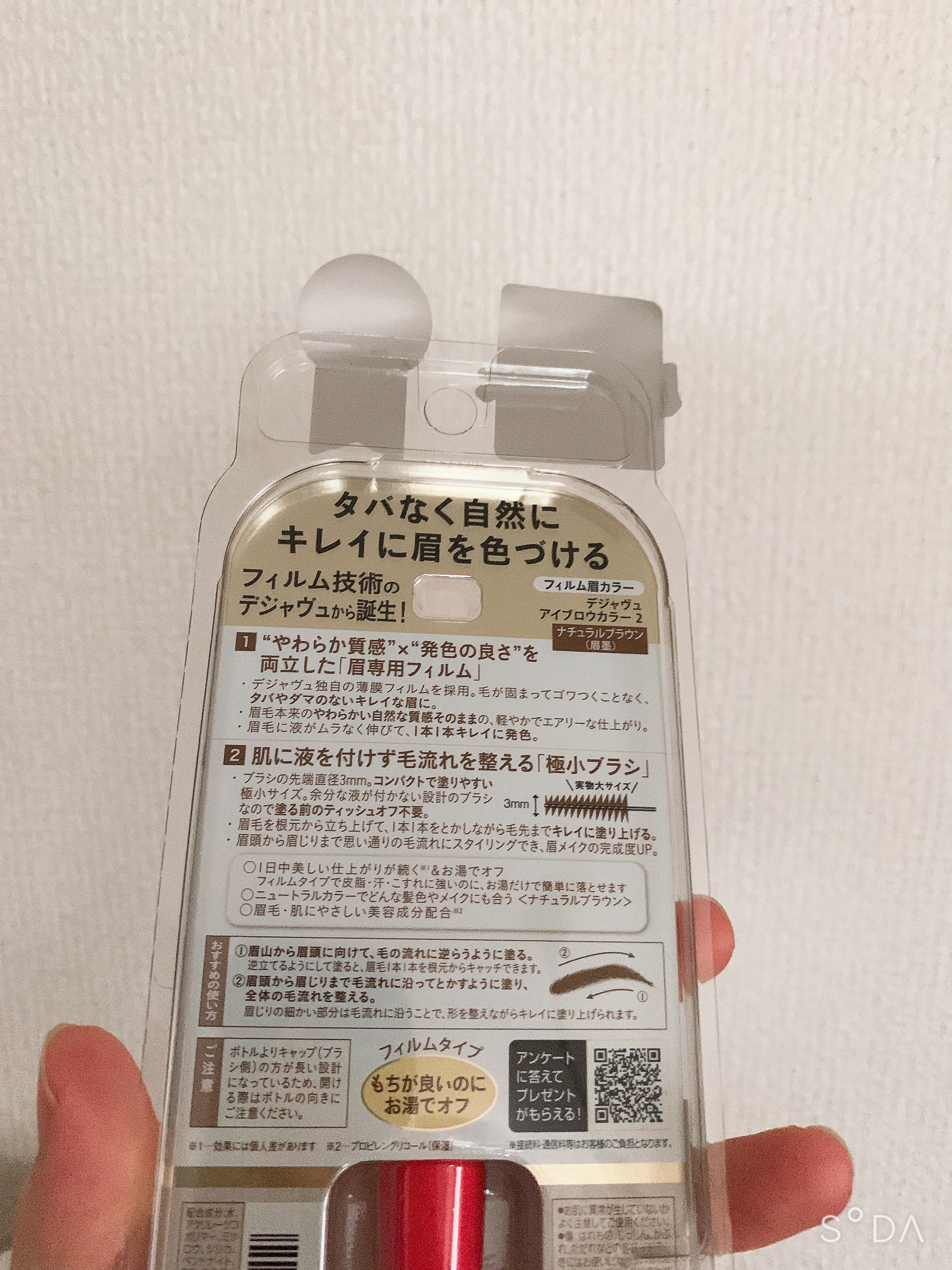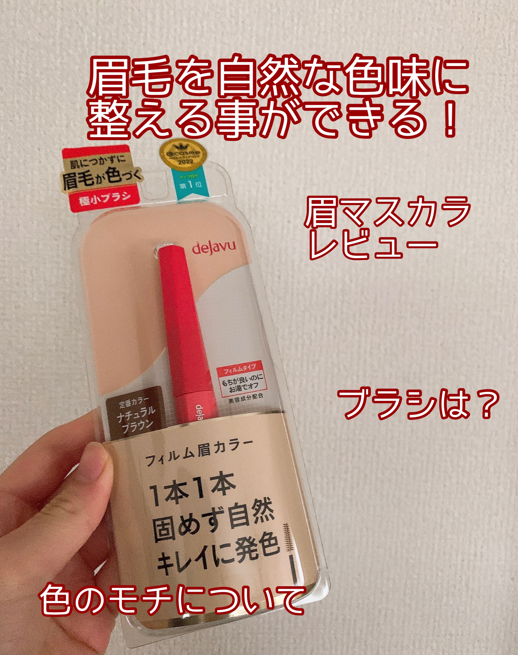 1本1本色づき固まらない「フィルム眉カラー」 塗りやすい極小ブラシで簡単垢抜け✨ デジャヴュ独自の薄膜フィルムを採用。 毛がパリッと固まらず、タバやダマのないふんわり自然な眉に。 フィルムタイプで速乾性が高く、皮脂・汗・こすれに強いのに、お湯だけで簡単に落とせます✨