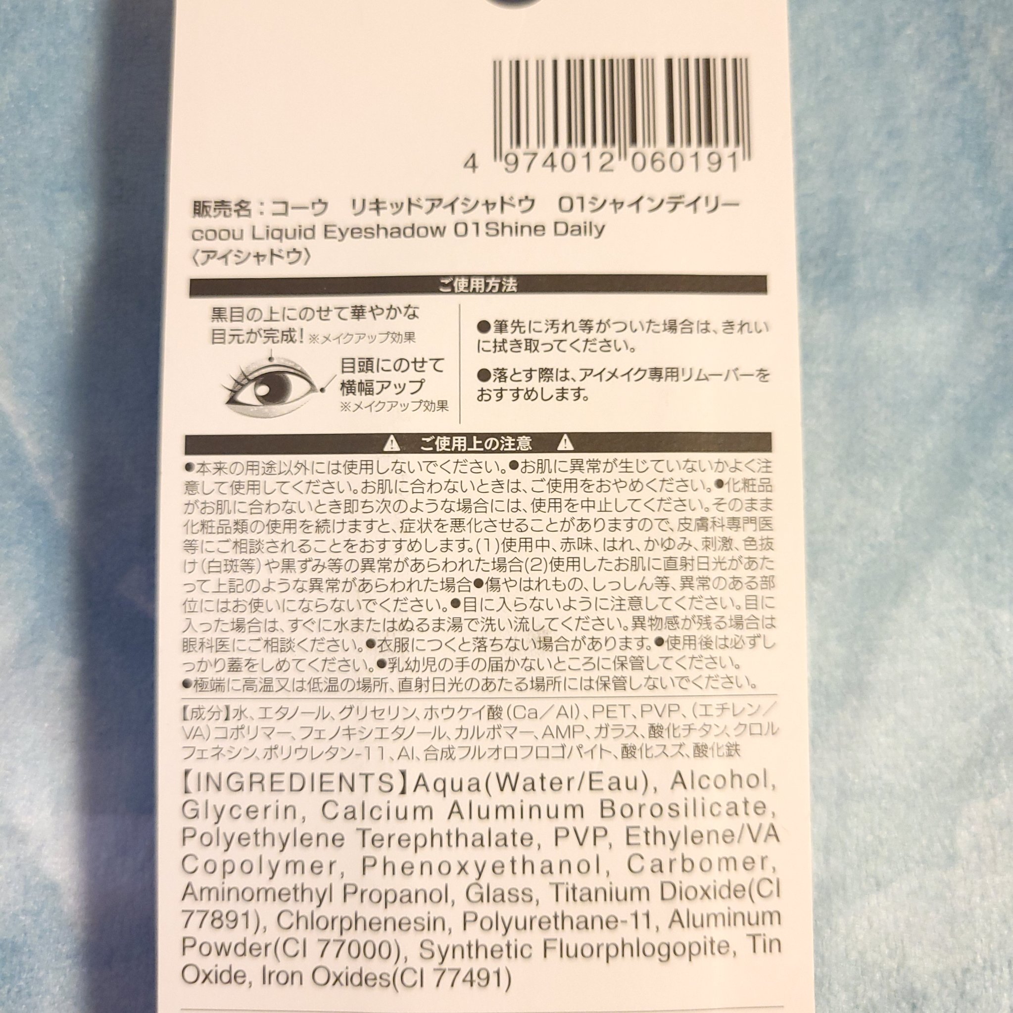 - <01 シャインディリー> 水、エタノール、グリセリン、ホウケイ酸(Ca/Al)、PET、PVP、(エチレン/VA)コポリマー、フェノキシエタノール、カルボマー、AMP、ガラス、酸化チタン、クロルフェネシン、ポリウレタン-11、Al、合成フルオロフロゴパイト、酸化スズ、酸化鉄 <02 シャンパンページュ> 水、エタノール、ホウケイ酸(Ca/Al)、グリセリン、マイカ、PVP、合成フルオロフロゴパイト、酸化チタン、フェノキシエタノール、酸化鉄、カルボマー、AMP、クロルフェネシン、酸化スズ <03 ダズリンゴールド> 水、エタノール、ホウケイ酸(Ca/Al)、グリセリン、PVP、合成フルオロフロゴパイト、PET、フェノキシエタノール、酸化チタン、カルボマー、AMP、マイカ、(エチレン/VA)コポリマー、ポリウレタン-11、クロルフェネシン、酸化鉄、酸化スズ、Al <04 オーロラピンク> 水、エタノール、PET、グリセリン、ホウケイ酸(Ca/Al)、PVP、フェノキシエタノール、カルボマー、AMP、クロルフェネシン、酸化チタン、マイカ、(エチレン/VA)コポリマー、ポリウレタン-11、酸化鉄、Al、酸化スズ