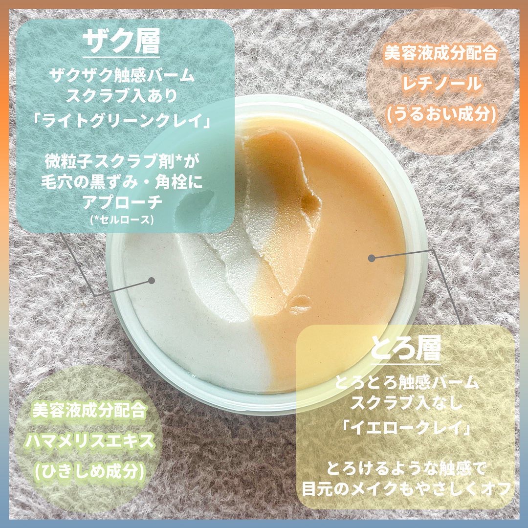滑らかなバームにスクラブと 天然クレイが配合された 毛穴の黒ずみ・角栓にもアプローチできる新感覚2層バームが登場🙌 小鼻などの毛穴汚れ/ざらつきが気になる部分にはスクラブ入りの「ザク層」「シャリ層」を、 目元など優しくメイクを落としたい部分にはとろける触感の「とろ層」と 2つのバームを好みに合わせて使い分けることができます◎ 洗浄力はきちんとあり、ウォータープルーフマスカラもキレイに落ちてくれます✨ #ザクとろバーム (さっぱりタイプ)はスクラブ感がしっかり+ レモングラスを中心としたフレッシュな天然精油の香り #シャリとろバーム (しっとりタイプ)はスクラブが控えめ+ ゼラニウムやラベンダーを中心としたリラクシングな天然精油の香り なので、スクラブの強さや香りの好みで選ぶのもいいかも👍