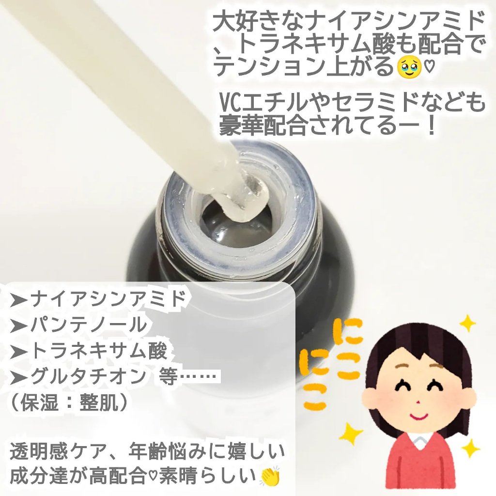 - <5番 白玉グルタチオンC美容液> コケモモ果実エキス(604,074ppm)、BG、ナイアシンアミド(50,000ppm)、パンテノール(50,000ppm)、精製水、1,2-ヘキサンジオール、ジカプリン酸ネオペンチルグリコール、トリ(カプリル酸/カプリン酸)グリセリル、ソルビトール、ビフィズス菌培養溶解質、トチャカエキス、シア脂、サトウキビエキス、α-アルブチン、ヒアルロン酸Na、メリアアザジラクタ花エキス、カミメボウキ葉エキス、メリアアザジラクタ葉エキス、ウコン根エキス、サンゴモエキス、シロキクラゲエキス、ペンチレングリコール、グリセリン、3-O-エチルアスコルビン酸、ビサボロール、トロメタミン、エチルヘキシルグリセリン、アデノシン、水添レシチン、アラントイン、グルタチオン、セラミドNP、β-グルカン、グリチルリチン酸2K、トコフェロール、アスコルビン酸、アスコルビルグルコシド、酢酸トコフェロール、ヒドロキシプロピルシクロデキストリン、ユビキノン、チオクト酸、水酸化K、ベヘニルアルコール、カルボマー、キサンタンガム、EDTA-2Na