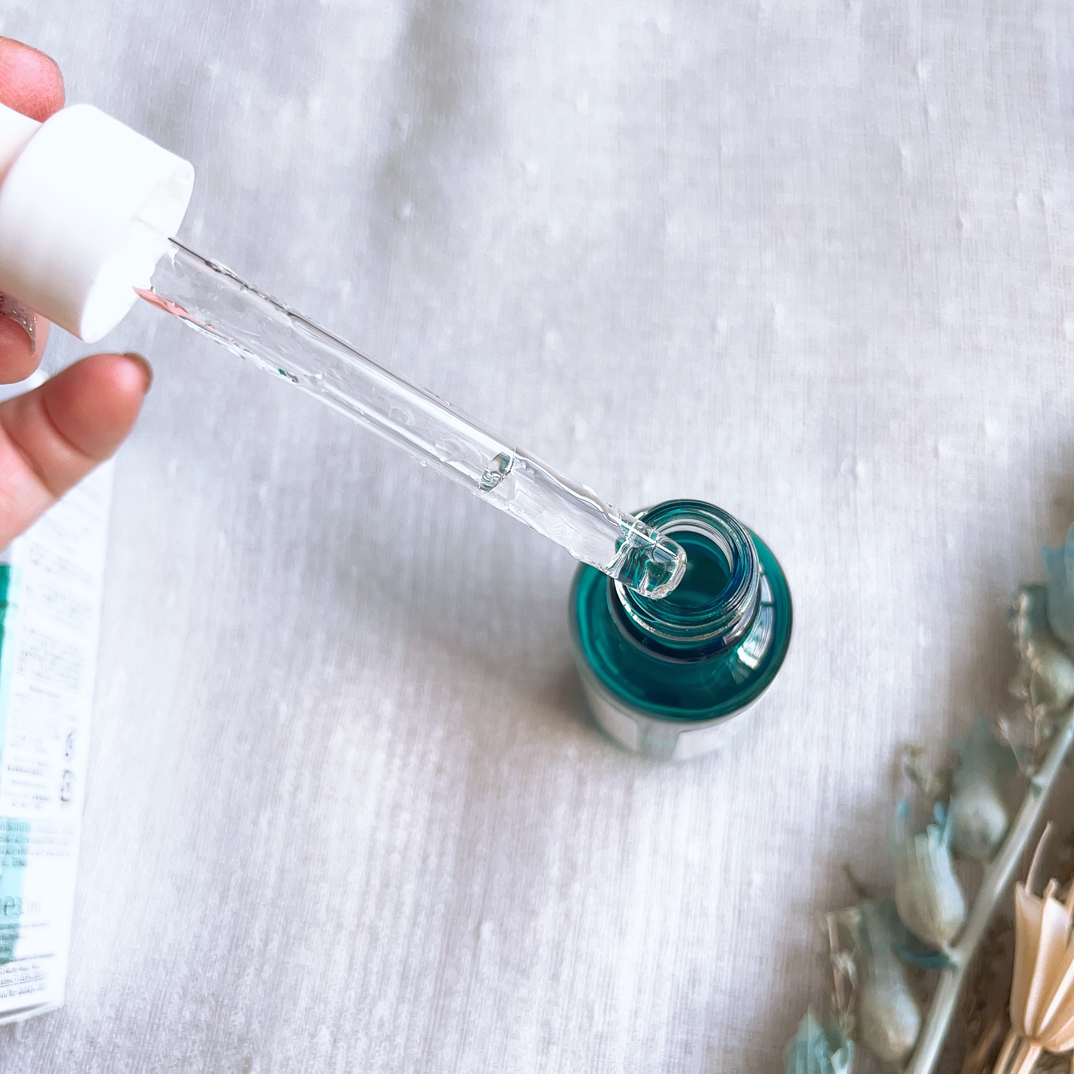 優しいオフホワイトのパッケージが見てるだけで嬉しい気持ちに。 中の化粧液は、ほんのーりトロミがあって柔らかいテクスチャー。 効果的な使い方は、1度顔全体に伸ばしたあと、さらに重ね付けすることなんだそう。