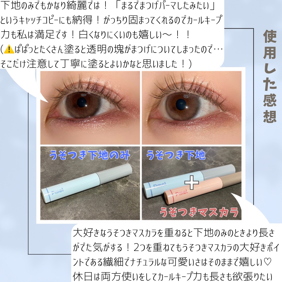 - メイクしたてのカールが夜まで続く!まるでまつげパーマしたみたい。#うそつき下地 強力カールキープで夜までクリアに上向きキープ! 白く残らずまつげになじむクリアカラー。 繊細セパレート仕上げ。 ウォータープルーフ。