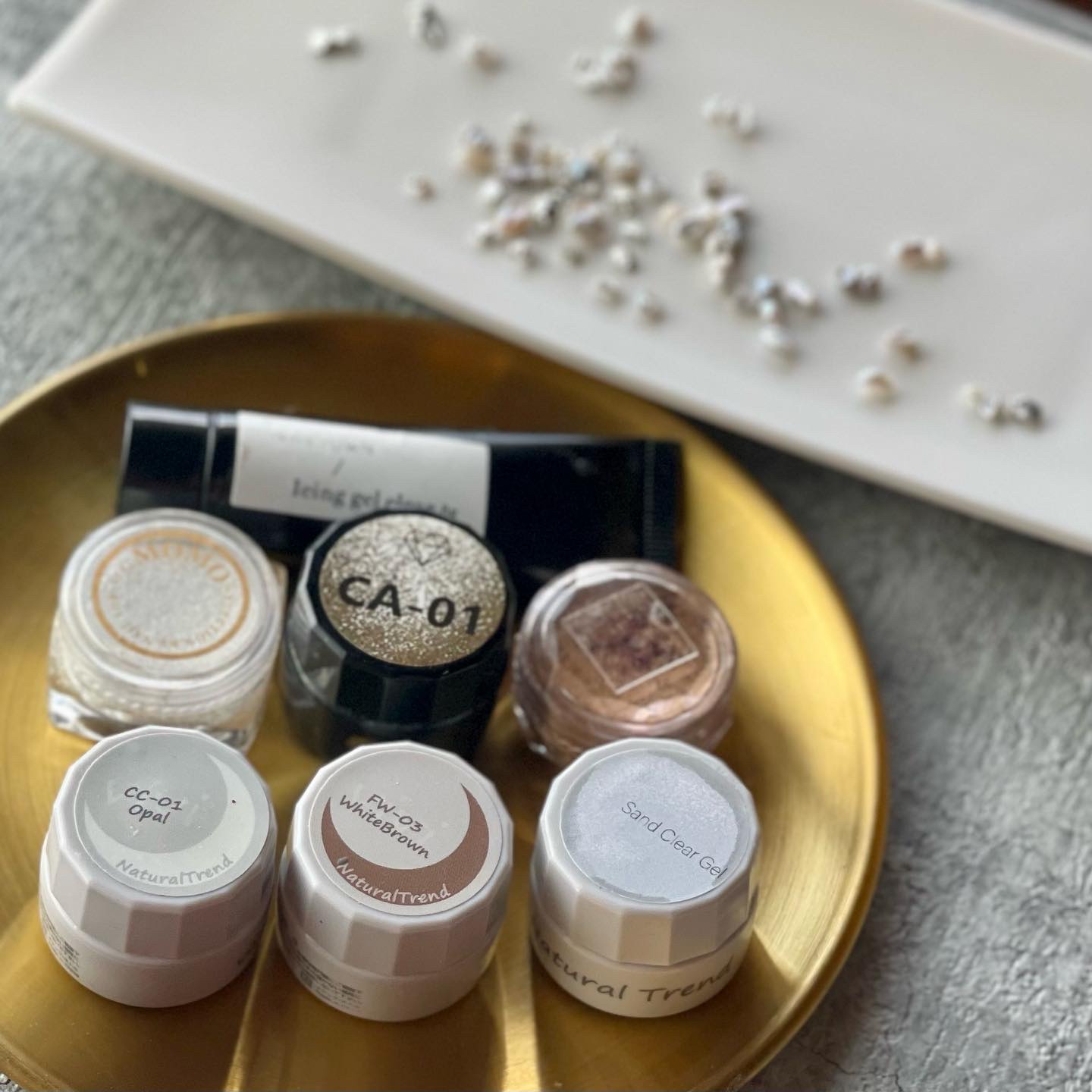 真ん中のはネイルタウン さんのパールジェルであえてハケ筋出してます😍 ベールみたいな波っぽいのは前postのライナーホワイトで❤︎ イロジェルはテクスチャーが固いというかねばっこくて塗りにくい🥲特にマットカラー。