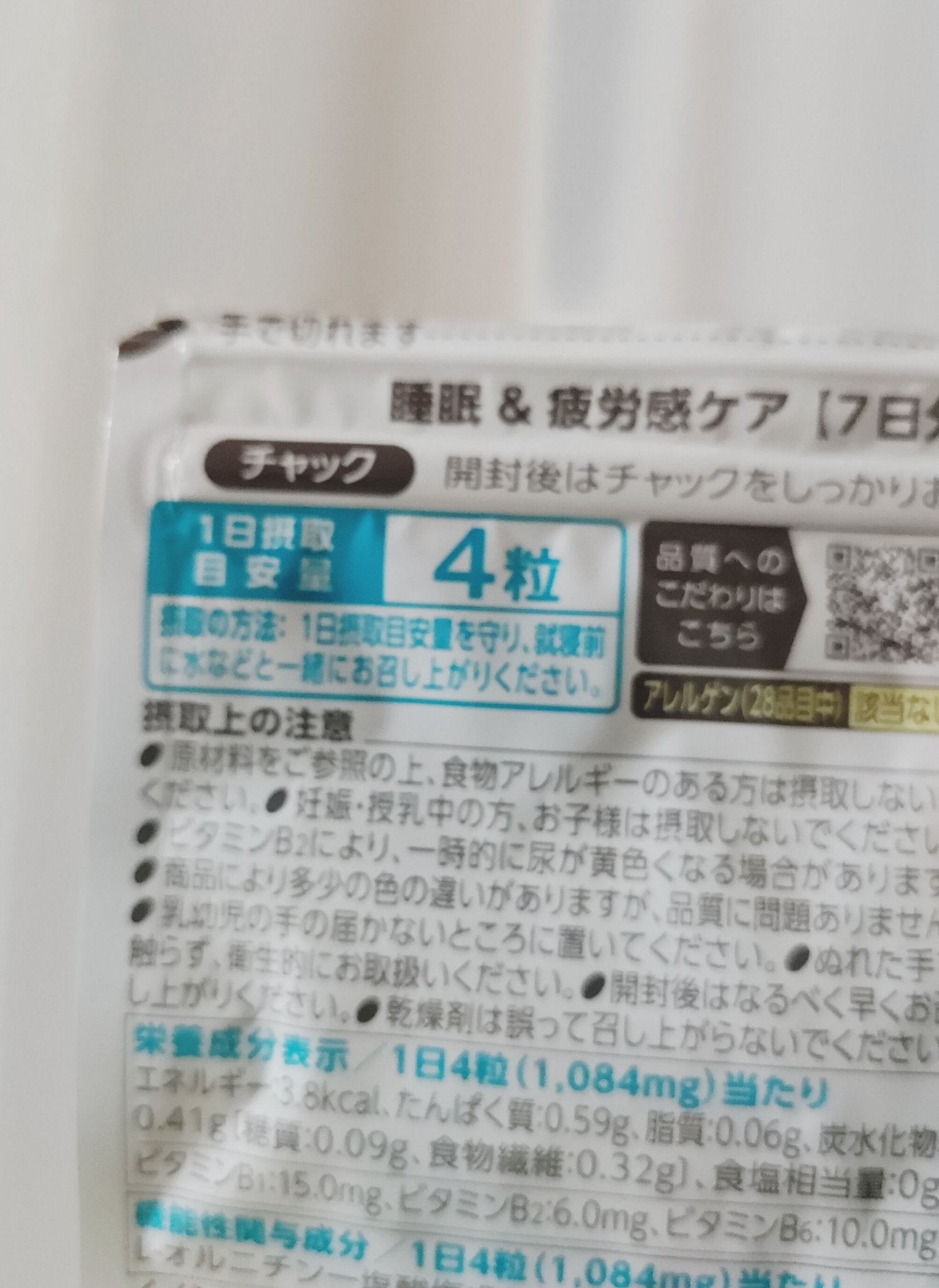 - 【機能性表示食品】朝起きた時から疲れを感じている方に。 毎日頑張る現代人には、睡眠の質を下げる要因が増えています。快活な1日のスタートのためにも、質のよい睡眠が大切です。 ファンケルの機能性表示食品「睡眠&疲労感ケア」 は、睡眠の質を高め、起床時の疲労感を軽減することが報告されたサプリメントです。 【1日の摂取目安】 4粒 【機能性関与成分/1日4粒当たり】 L-オルニチンー塩酸塩:500mg、クロセチン:7.5mg 届出表示:本品にはL-オルニチン一塩酸塩・クロセチンが含まれます。L-オルニチン一塩酸塩は、睡眠の質(長く眠った感覚)を高め、より良い気分の目覚めをサポートすることが報告されています。 クロセチンは、起床時の疲労感を軽減することが報告されています。 【その他の栄養成分/1日4粒当たり】 ビタミンB1:15.0mg、ビタミンB2:6.0mg、ビタミンB6:10.0mg 【機能性表示食品についてのご注意】 ※本品は、特定保健用食品と異なり、消費者庁長官による個別審査を受けたものではありません。 ※疾病の診断、治療、予防を目的としたものではありません。 ※食生活は、主食、主菜、副菜を基本に、食事のバランスを。 【原材料名】 L-オルニチンー塩酸塩(アメリカ製造)、でんぷん/セルロース、ショ糖エステル、イノシトール、ヒドロキシプロピルセルロース、微粒二酸化ケイ素、ビタミンB1、クチナシ色素、ステアリン酸マグネシウム、ビタミンB6、ビタミンB2、シェラック 【アレルゲン(28品目中)】 該当なし 【ご注意】 ※妊娠・授乳中の方、お子様はお召し上がりにならないでください。