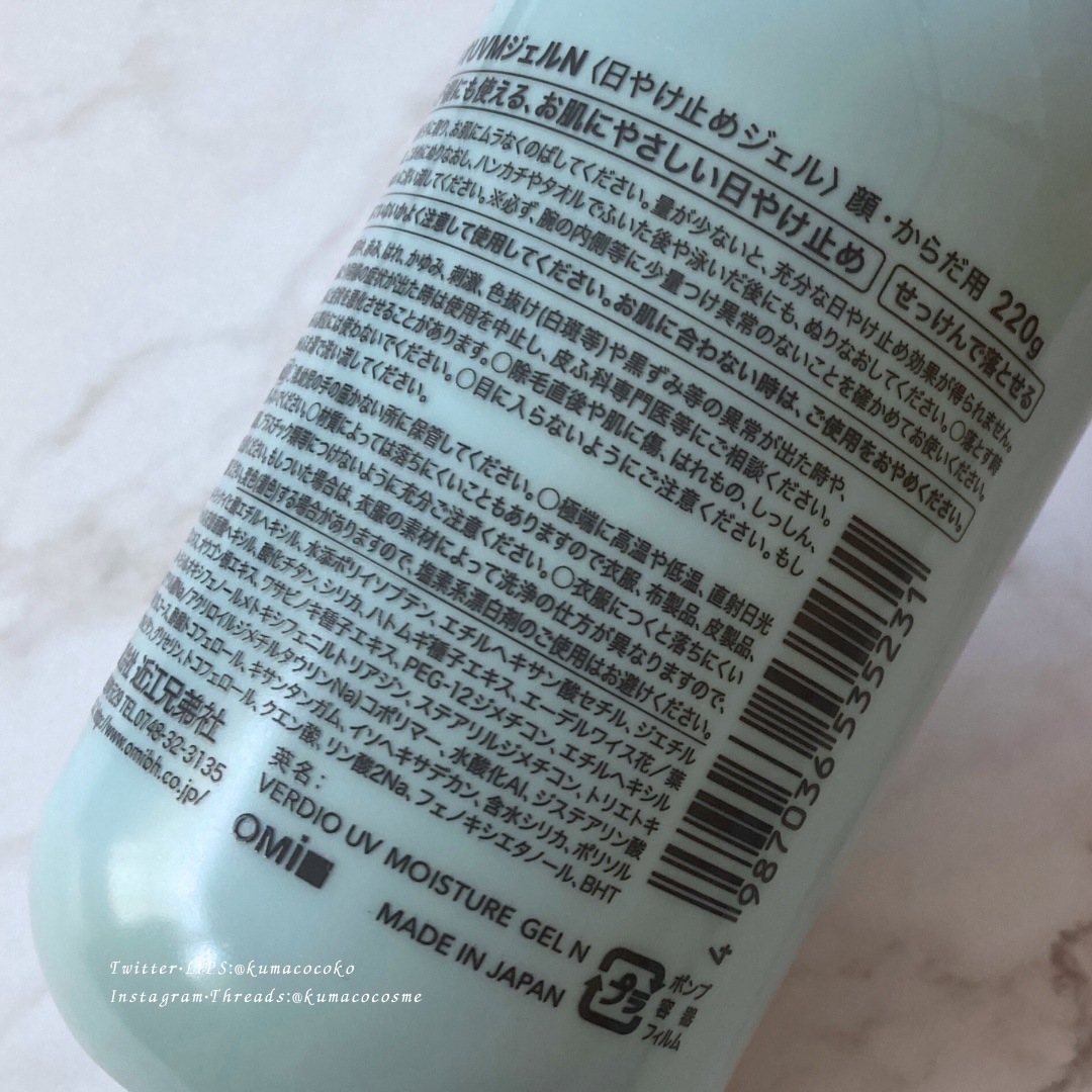 どちらもSPF50/PA++++で日やけ止め効果が高く、みずみずしいテクスチャー。 ベタつきがなくて、しっとりスルッと塗ることができます。 うるおい成分のCICA(ツボクサエキス)が配合されているし、せっけんで落とすことができるのも毎日使いやすいですよね。 「ベルディオ UVモイスチャージェルN」は、1歳から使えるそうです。 親子で使いやすい、容量がたっぷりのポンプタイプ。