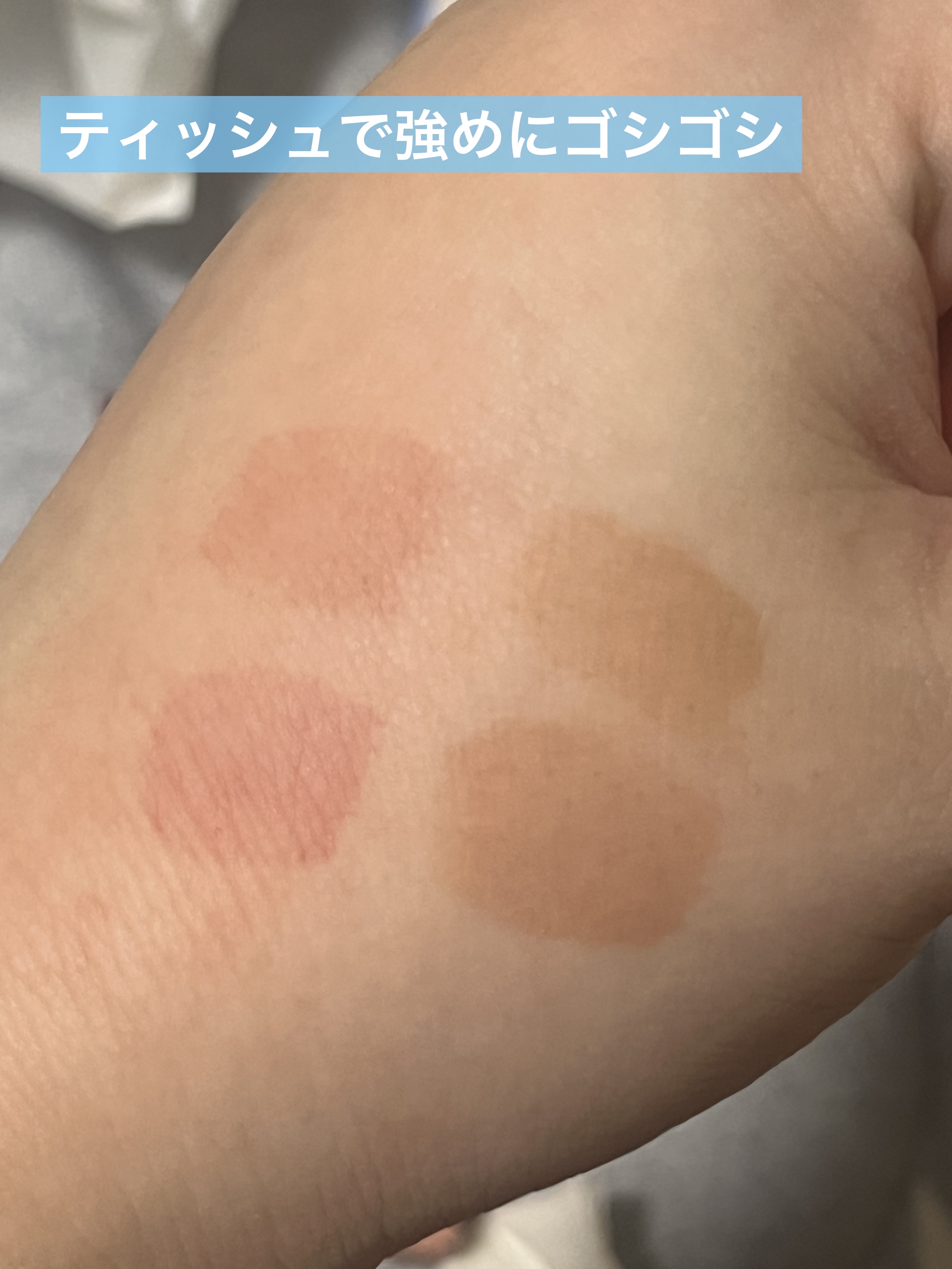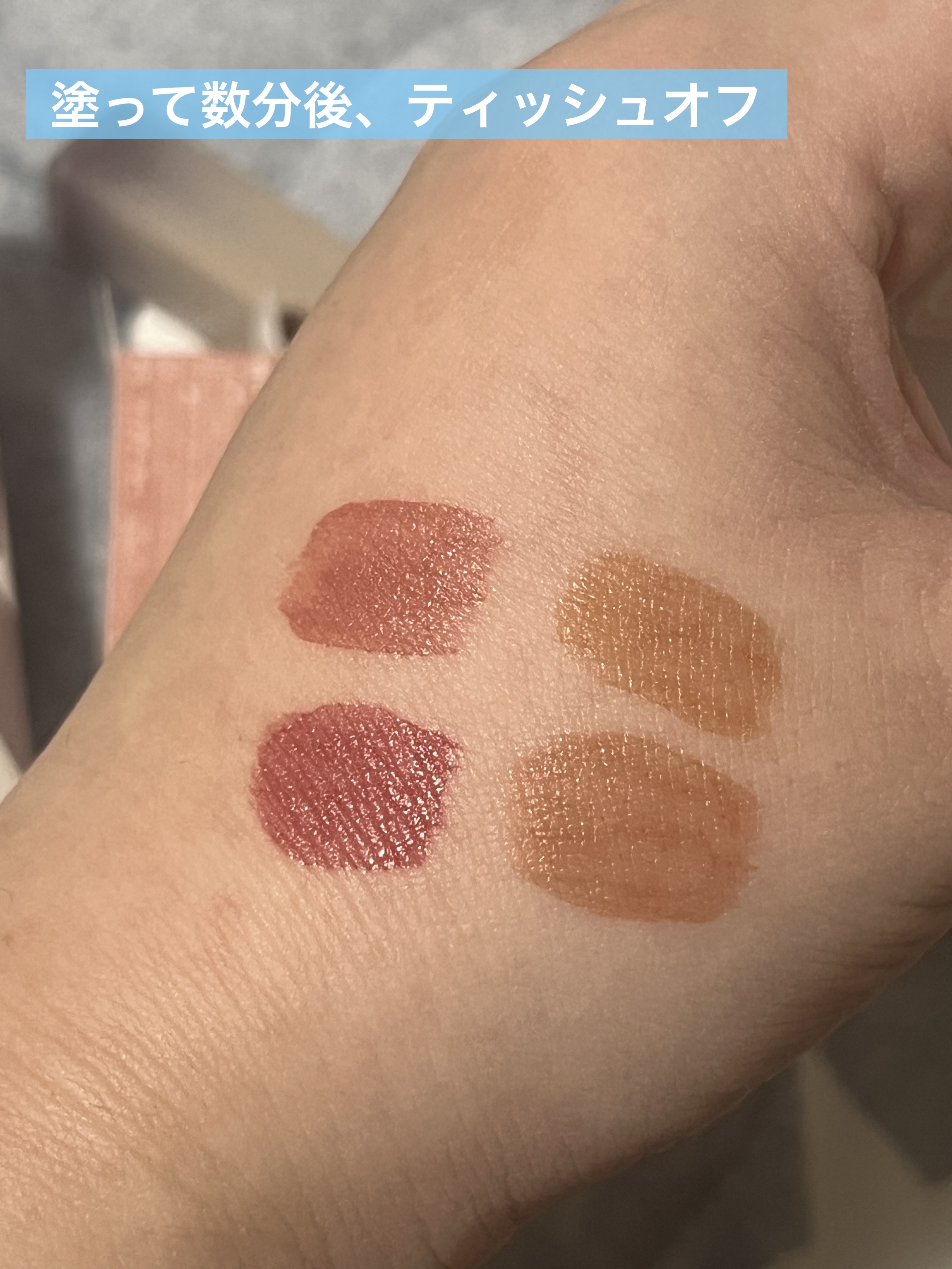 Fujikoのニュアンスラップティントは、他にも書かれてる方がいましたが、イエベ寄りのカラーが多くて、評判はいいけど手を出せずにいました。 花車ボルドーは『ほんっっっっっの少し青みに寄ったピンクベージュ』というのが私の印象。ちょっと暗めだから、ベージュとブラウンの間くらいかな。めっちゃヌーディー。ブルベに似合うピンクベージュ。 店頭で試した花車ベージュは、逆に黄色に寄ったオレンジベージュカラーでした。黄色みが似合う方にはおすすめ。コーラル感とかはなかったので、人を選びそうなカラーだなという印象。