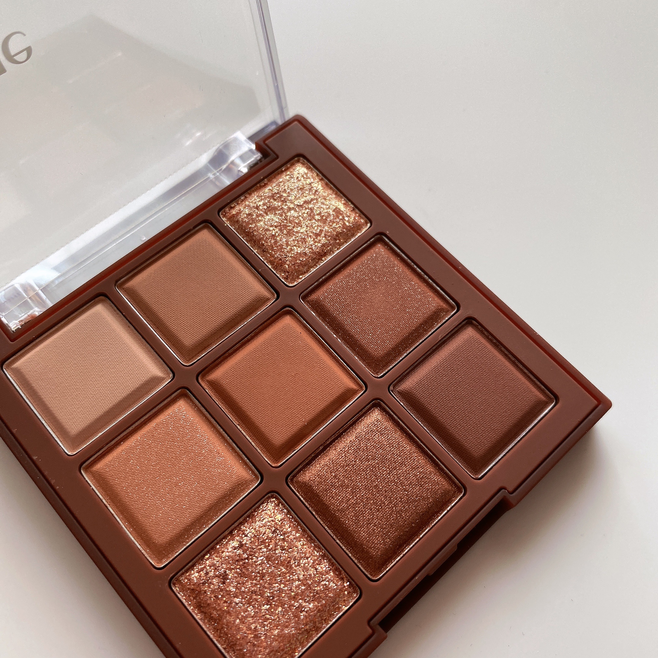奥ゆかしいチョコレートブラウンムードを詰め込んだアイシャドウパレット🧸 色味はもちろん、アイシャドウが立体的になっていて、本物のチョコレートみたいな、見た目からして可愛い❣️ マットからラメ、グリッターまでバリエーション豊富な9色で、思いのままにアイメイクができる万能パレット🐰