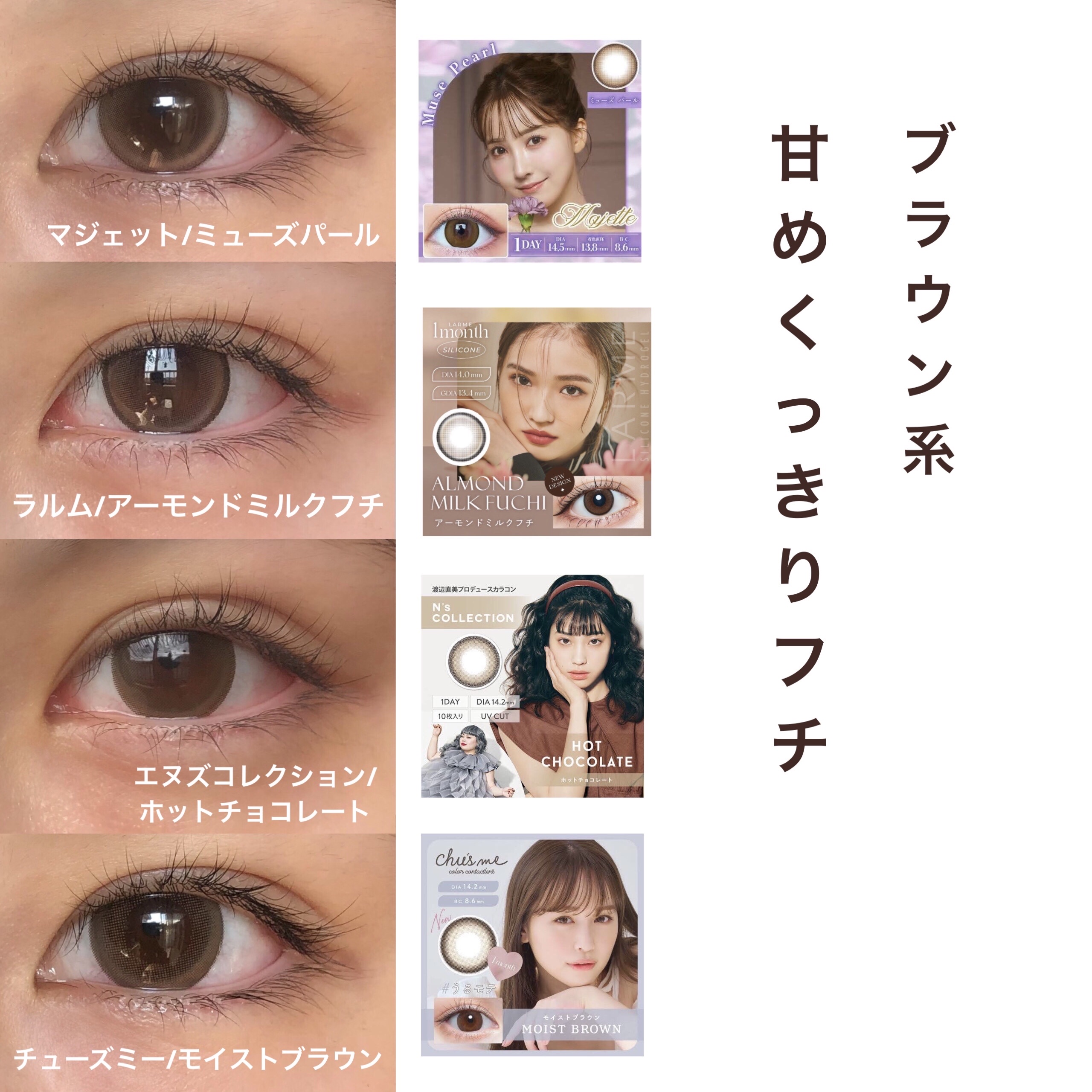 小粒目でも宇宙人にならない。極細フチと暗めのカラー。学校いけた🙆♀ フチありの中では割と小さめ。色も明るめなので韓国っぽい。校則厳しいとバレそう! めっちゃ白目透ける!けど変な透けじゃなくて透明感って感じ。学校は🙅♀ マンスリーでこの大きさのくっきり細フチは逸材!白目は少し透けるけど気にならない!すき!学校につけていってた🙆♀ 12.7mm?裸眼と変わらないよって思うべ?ちょー盛れます。フチ過ぎないくっきりフチなの。ほんとに。そしてまじバレない🙆♀ ワンデーとマンスリーで全然違う!ワンデーめっちゃ白目透けてリピなしだなって思ってたのにマンスリー買ったらちゃんと可愛い。なんの差? パールリング、モカロール、パールベージュの3つは正直違い分かんない!!笑 モイストブラウンとアーモンドミルクフチはマンスリー🈶るから1ヶ月カラコン探してる人はまじ使って見てほしい👀