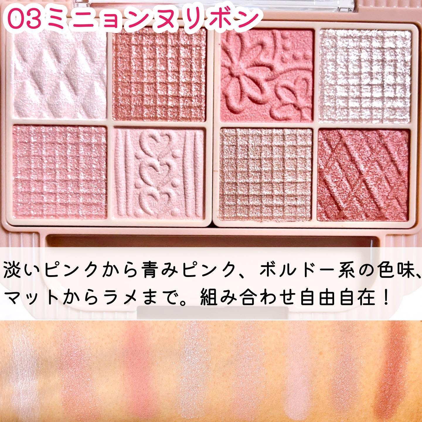 キャンメイク プティパレットアイズ 03 ミニョンヌリボン 1078円(税込) このパレットのカラーは全体的にピンクよりの甘めのカラー 捨て色なしでマットやラメ、パールがあるからいろんなアイメイクが出来るから楽しい♡ 購入したスーパーの閉店セールで10%offの1078円→828円でGET