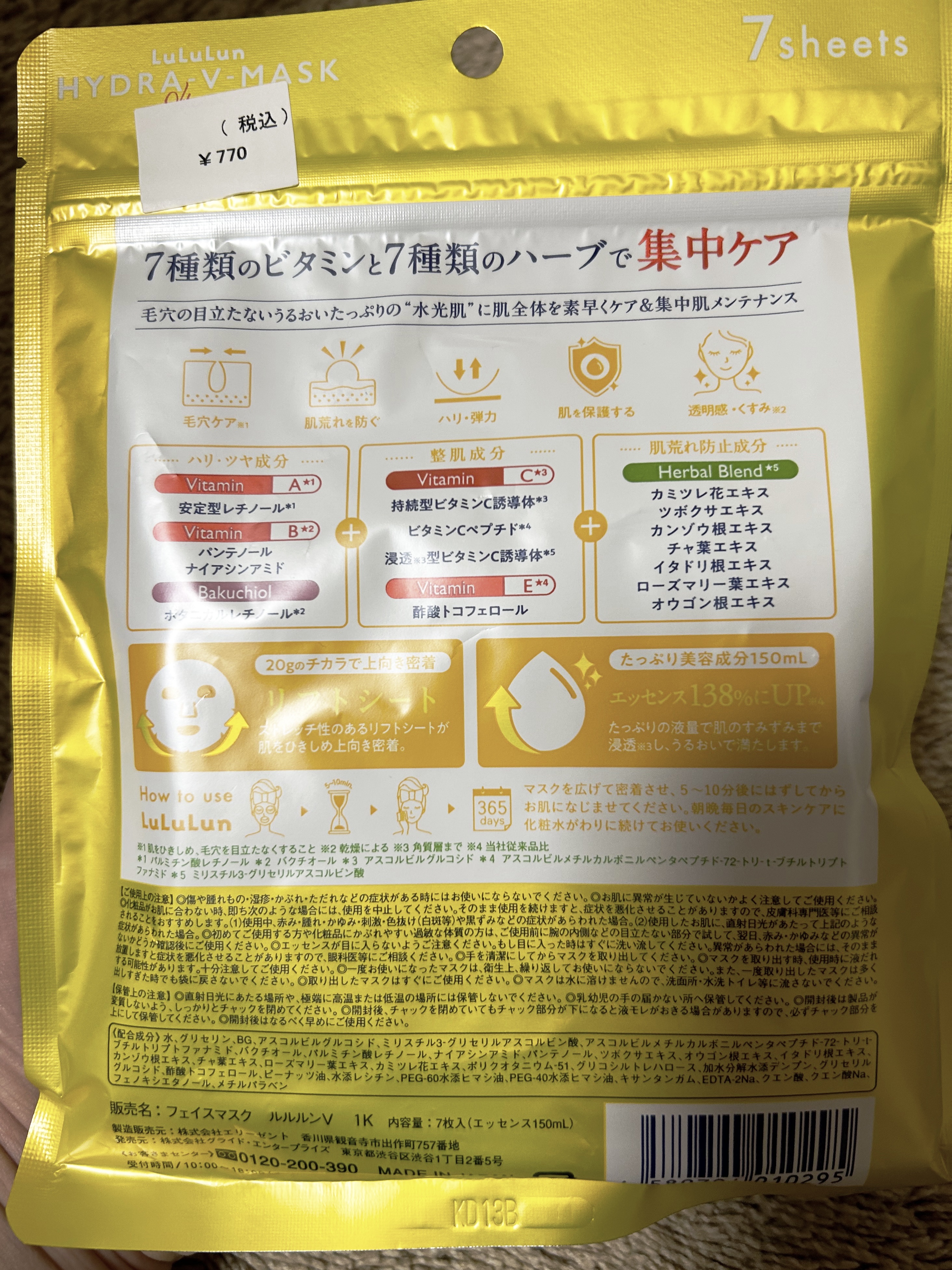 整肌成分のエクソソーム、グルタチオン、アルブチン、レシチン配合 ⭐️ルルルン ハイドラ EX マスク💜 7種のビタミン配合(レチノール、バクチオール、ナイアシンアミド、ビタミンCペプチド、浸透型ビタミンC誘導体、パンテノール、持続型ビタミンC誘導体、酢酸トコフェロール) ⭐️ルルルン ハイドラ V マスク💛 毛穴引き締め成分のフラーレン、安定型ビタミンC、黒ハチミツ配合 ⭐️ルルルン ハイドラ F マスク