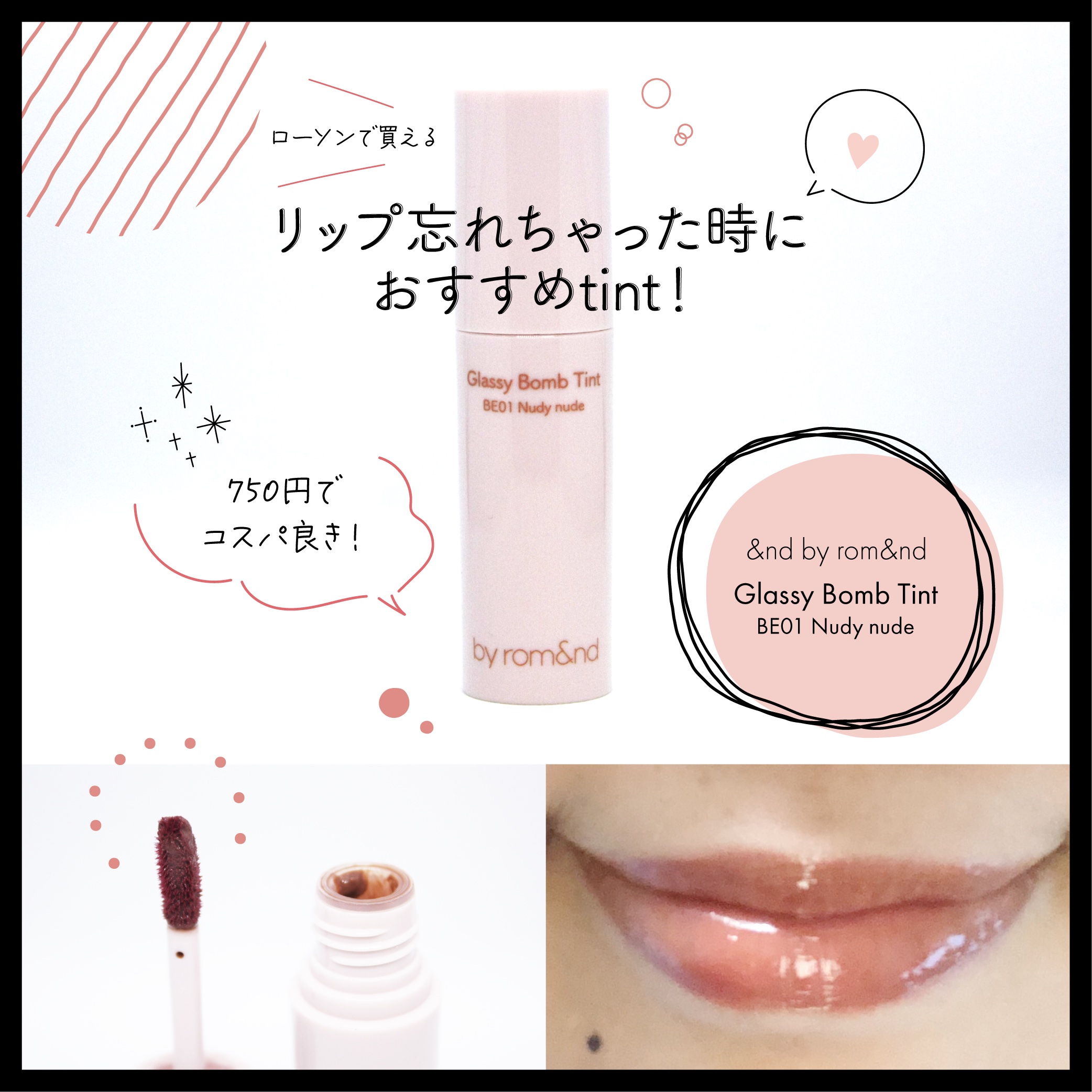 ローソン限定!ロムアンドコラボティント♡&ndbyrom&nd「アンドバイロムアンド グラッシーボムティント」 ¥820・BE01ヌーディーヌード・BR01デザートブリック・BR02ローズビーン・BR03ココアブラウン・VD01Milkyco...
