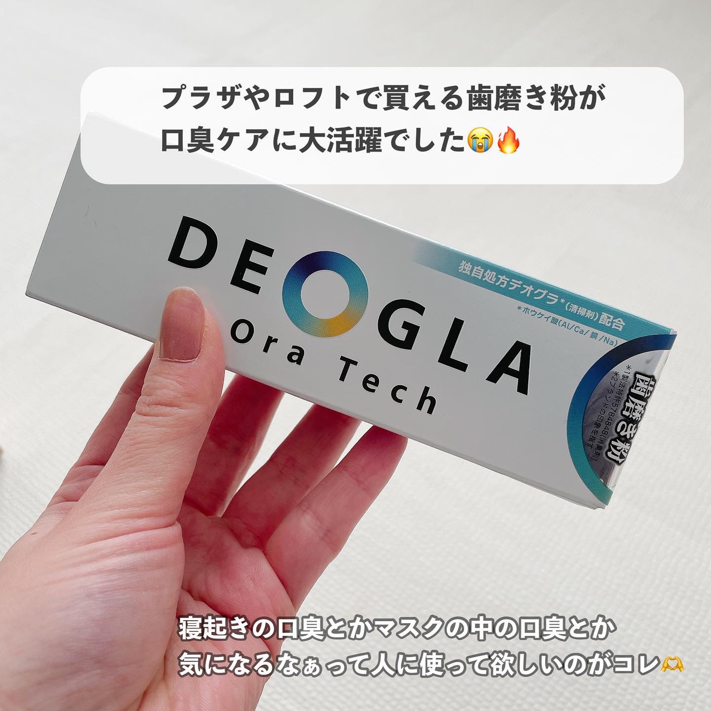 - \独自成分「DEOGLA®︎」(清掃剤)配合/ 創業200年を超える素材メーカーがつくる口臭ケアに特化した歯磨き粉! 製品の特長: 日常的に人が不快に感じる口臭の原因のひとつが、揮発性の臭い物質(メチルメルカプタンなど)の発生です。デオグラオーラテックでブラッシングすることで、原因*を除去。口臭を防いでスッキリした爽やかさが長く続きます。 *食べカスや歯垢など ▶2024.10.1より価格改定及びパッケージリニューアル 1,980円(税込) ▷▷▷ 1,540円(税込) 口臭に特化した処方はそのままに、さらにお求めやすくなりました ▶独自成分DEOGLA : 化粧品成分名称 ホウケイ酸(Al/Ca/銅/Na)