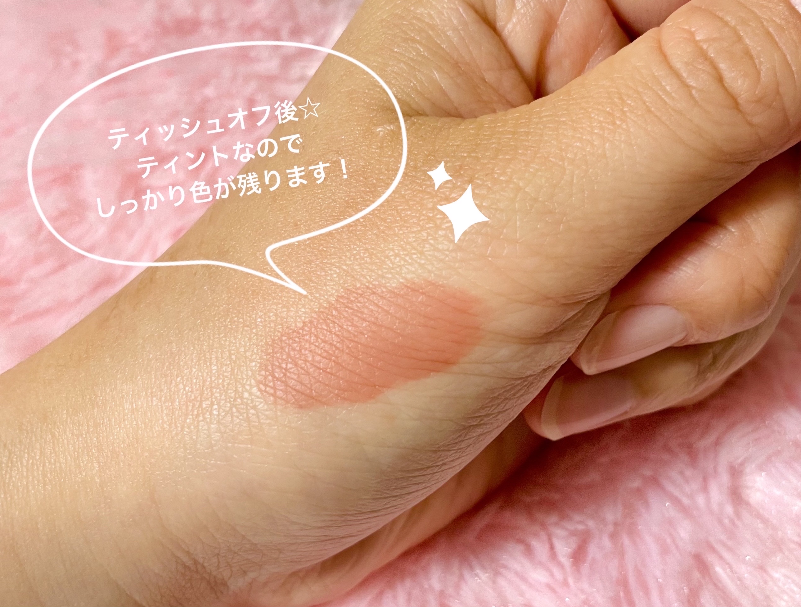 塗りたてはツヤ系、時間経過でマットっぽくなるティントリップ。塗ってすぐティッシュオフでも色がしっかりついたままマットっぽくなります。 数回使用しましたが今の所唇の皮剥けがなく快適です。