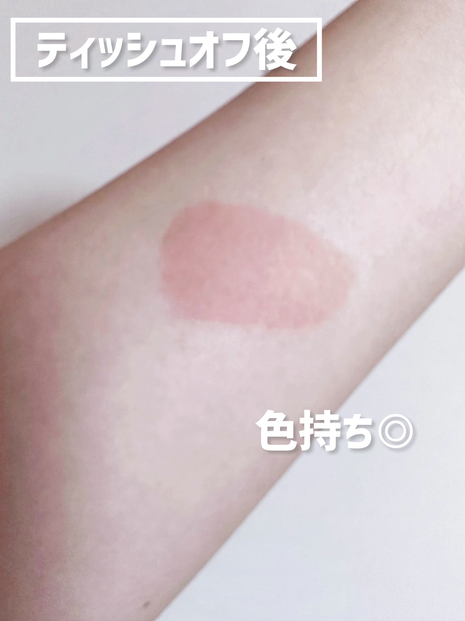【質感】唇荒れてても塗りやすいぷるんと感 【保湿】ティッシュオフしても保湿されてた(感動) 【良いところ】唇荒れやすい人でも使いやすい、ティントの色素沈着もない、色ムラになりにくい