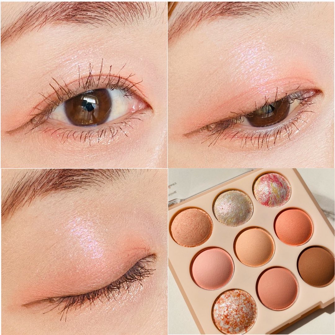 マットは肌に溶け込むような粉質でボソボソしません! シマーのしっとりした粉質も密着してくれて好き!!! 1番キラキラなのは右上のラメですね🍑💓でも粒が大きくないので、大人も使いやすいラメだと思います🥰 どの色使おうか迷うけど、どれ使っても本当可愛くて、自分が桃になったかのような🍑(笑)多幸感あふれるパレットです💘