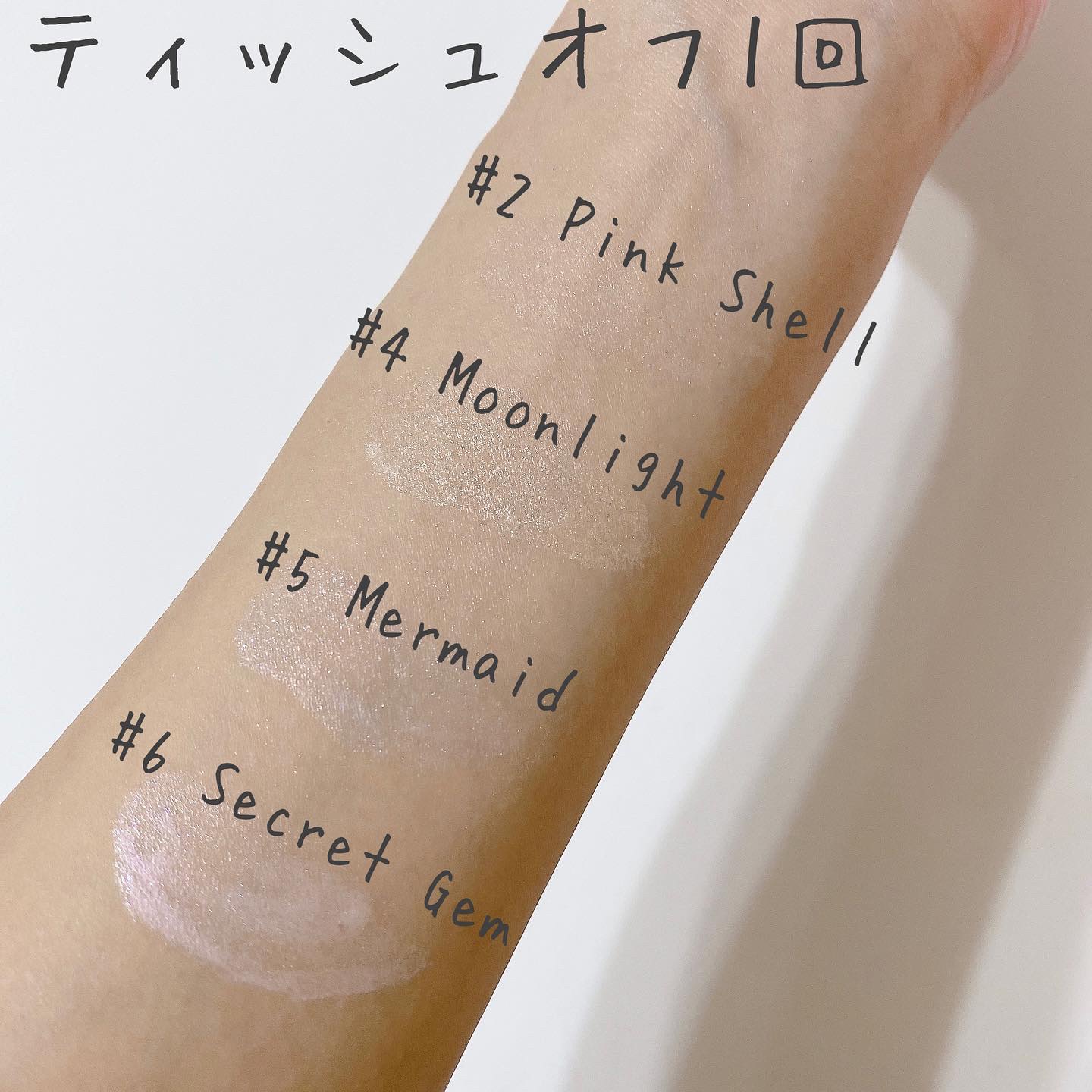 - <2 ピンクシェル(Pink Shell)> 水添ポリ(C6-14オレフィン)、トリイソステアリン酸ポリグリセリル-2、水添(スチレン/イソプレン)コポリマー、炭酸ジカプリリル、マイカ、酸化チタン、合成フルオロフロゴパイト、1,2-ヘキサンジオール、酸化鉄、安息香酸ベンジル、酸化スズ、水、シリカ、アルガニアスピノサ核油、BG、トコフェロール、リナロール、リモネン、モモ果実エキス、ヒアルロン酸Na、加水分解コラーゲン、ヒアルロン酸ヒドロキシプロピルトリモニウム、エチルヘキシルグリセリン、加水分解ヒアルロン酸、アセチルヒアルロン酸Na、ヒアルロン酸、加水分解ヒアルロン酸Na、ヒアルロン酸クロスポリマーNa、ヒアルロン酸K、フェノキシエタノール、香料 <4 ムーンライト(Moonlight)> 水添ポリ(C6-14オレフィン)、トリイソステアリン酸ポリグリセリル-2、水添(スチレン/イソプレン)コポリマー、炭酸ジカプリリル、マイカ、酸化チタン、1,2-ヘキサンジオール、水、酸化鉄、酸化スズ、テトラ(ジ-t-ブチルヒドロキシヒドロケイヒ酸)ペンタエリスリチル、アルガニアスピノサ核油、トコフェロール、BG、モモ果実エキス、ヒアルロン酸Na、加水分解コラーゲン、ヒアルロン酸ヒドロキシプロピルトリモニウム、エチルヘキシルグリセリン、アセチルヒアルロン酸Na、加水分解ヒアルロン酸、ヒアルロン酸、ヒアルロン酸クロスポリマーNa、加水分解ヒアルロン酸Na、ヒアルロン酸K、フェノキシエタノール、香料 <5 マーメイド(Mermaid)> 水添ポリ(C6-14オレフィン)、トリイソステアリン酸ポリグリセリル-2、水添(スチレン/イソプレン)コポリマー、炭酸ジカプリリル、マイカ、酸化チタン、合成フルオロフロゴパイト、1,2-ヘキサンジオール、酸化スズ、水、コンジョウ、テトラ(ジ-t-ブチルヒドロキシヒドロケイヒ酸)ペンタエリスリチル、アルガニアスピノサ核油、トコフェロール、BG、モモ果実エキス、ヒアルロン酸Na、加水分解コラーゲン、ヒアルロン酸ヒドロキシプロピルトリモニウム、エチルヘキシルグリセリン、アセチルヒアルロン酸Na、加水分解ヒアルロン酸、ヒアルロン酸、ヒアルロン酸クロスポリマーNa、加水分解ヒアルロン酸Na、ヒアルロン酸K、フェノキシエタノール、香料 <6 シークレットジェム(Secret Gem)> 水添ポリ(C6-14オレフィン)、トリイソステアリン酸ポリグリセリル-2、水添(スチレン/イソプレン)コポリマー、炭酸ジカプリリル、酸化チタン、マイカ、合成フルオロフロゴパイト、1,2-ヘキサンジオール、水、酸化スズ、テトラ(ジ-t-ブチルヒドロキシヒドロケイヒ酸)ペンタエリスリチル、アルガニアスピノサ核油、トコフェロール、カルミン、コンジョウ、BG、モモ果実エキス、ヒアルロン酸Na、加水分解コラーゲン、ヒアルロン酸ヒドロキシプロピルトリモニウム、エチルヘキシルグリセリン、アセチルヒアルロン酸Na、加水分解ヒアルロン酸、ヒアルロン酸、ヒアルロン酸クロスポリマーNa、加水分解ヒアルロン酸Na、ヒアルロン酸K、フェノキシエタノール、香料