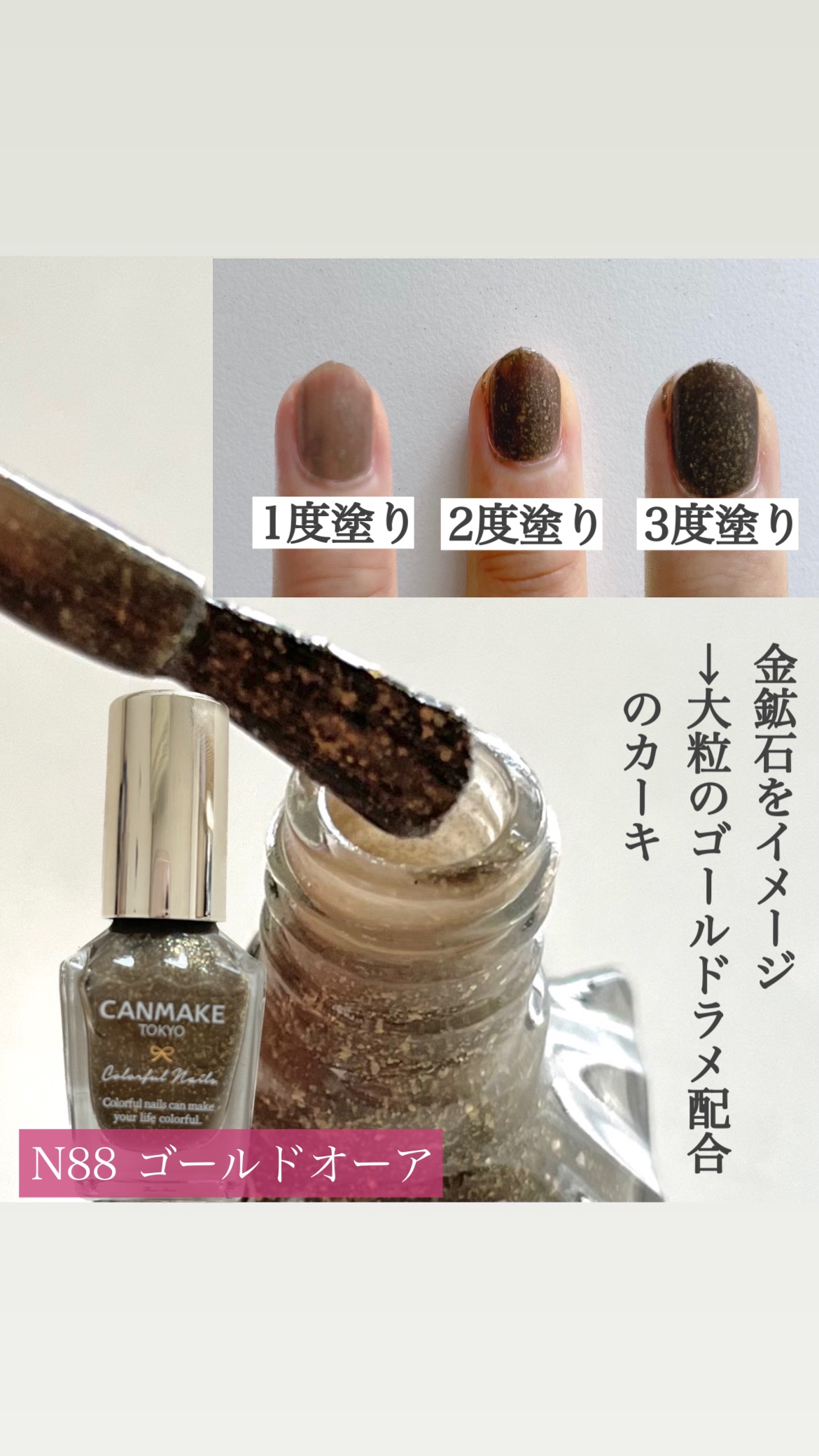 キャンメイクの緑ネイルで秋の爪先をお洒落みえ⋆⸜💚⸝⋆ キャンメイク カラフルネイルズ 各¥396 〚N12 アーモンドグリーン〛 〚N26 レディカーキ〛 〚N84 ヘイジーレイン〛 〚N88 ゴールドオーア〛 〚N89 モッシーグリーン〛 〚N107 葉洩れ日〛 〚N26〛は廃番 amazonやメイクアップソリューション等のECサイトでまだ購入できるので気になる方はチェックしてみてください🤲🏻✨