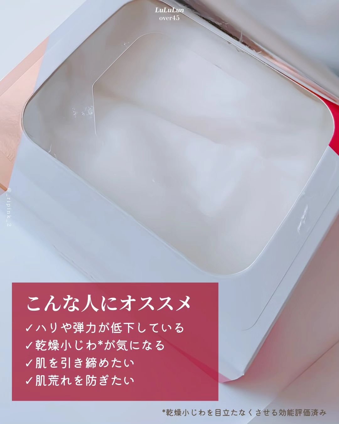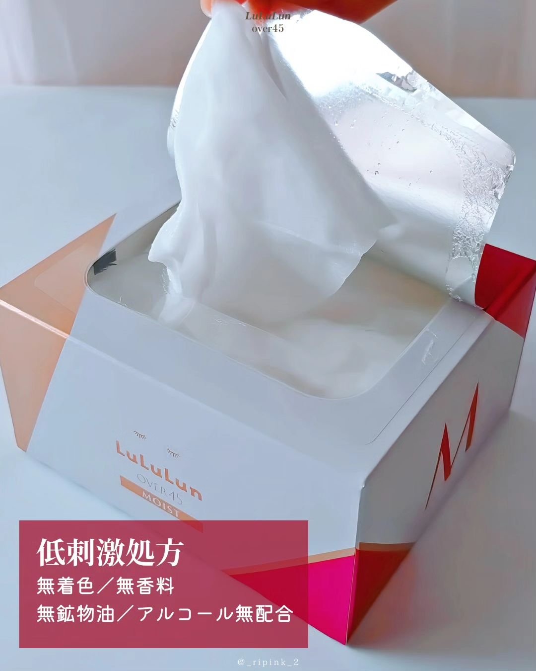 年齢を重ねた方向けの「LuLuLun OVER45」が発売されています。 年齢にあらがうのではなく、いろんな経験を重ねた美しさに磨きをかけるエイジングケアを、と言うコンセプトで生まれたそう! 超極厚ふっくらシートで作られているので、顔全体を優しく包み込んでくれそう! 大人肌の「質」の変化に着目し、キュッと引き締めながらハリのある肌にサポートしてくれるマスク。