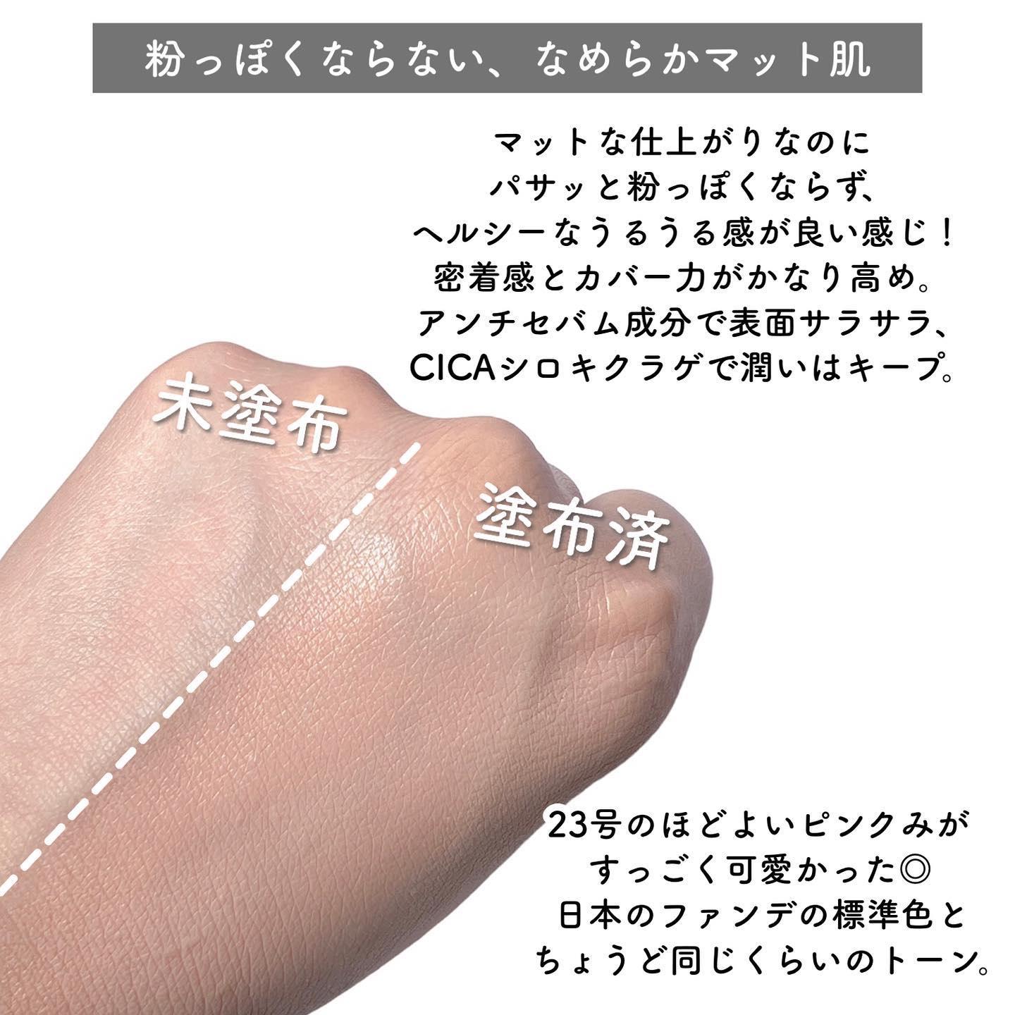 - <N21 ライトベージュ> 水、シクロペンタシロキサン、酸化チタン、酸化亜鉛、BG、ジ(カプリル/カプリン酸)BG、ラウリルPEG-10トリス(トリメチルシロキシ)シリルエチルジメチコン、トリメチルシロキシケイ酸、イソドデカン、サリチル酸ブチルオクチル、ナイアシンアミド、セチルPEG/PPG-10/1ジメチコン、硫酸Mg、水酸化Al、黄酸化鉄、(カプリル酸/カプリン酸)グリセリズ、ステアリン酸、イソステアリン酸ポリグリセリル-4、ポリグリセリル-3ポリジメチルシロキシエチルジメチコン、ポリメタクリル酸メチル、トリエトキシカプリリルシラン、1,2-ヘキサンジオール、クオタニウム-90ベントナイト、(アクリレーツ/メタクリル酸ポリトリメチルシロキシ)コポリマー、(トリメチルシロキシケイ酸/ジメチコノール)クロスポリマー、赤酸化鉄、黒酸化鉄、香料、アデノシン、シリカ、シロキクラゲエキス、ツボクサエキス、ポリグルタミン酸、カワラタケエキス、トコフェロール、レイシエキス、ヒアルロン酸Na、ウルムスダビディアナ根エキス、クズ根エキス、メマツヨイグサ花エキス、ダイオウショウ葉エキス、セイヨウハッカ葉エキス、マヨラナ葉エキス、カニナバラ果実エキス、タチジャコウソウ葉エキス、ハナビラタケエキス、メシマコブエキス、サッカロミセス培養液、プロポリスエキス、アシアチコシド、アシアチン酸、マデカッソシド、マデカシン酸 <N23 ナチュラルベージュ> 水、シクロペンタシロキサン、酸化チタン、酸化亜鉛、BG、ジ(カプリル/カプリン酸)BG、ラウリルPEG-10トリス(トリメチルシロキシ)シリルエチルジメチコン、トリメチルシロキシケイ酸、イソドデカン、サリチル酸ブチルオクチル、ナイアシンアミド、セチルPEG/PPG-10/1ジメチコン、硫酸Mg、黄酸化鉄、水酸化Al、(カプリル酸/カプリン酸)グリセリズ、ステアリン酸、トリエトキシカプリリルシラン、イソステアリン酸ポリグリセリル-4、ポリグリセリル-3ポリジメチルシロキシエチルジメチコン、ポリメタクリル酸メチル、1,2-ヘキサンジオール、クオタニウム-90ベントナイト、赤酸化鉄、(アクリレーツ/メタクリル酸ポリトリメチルシロキシ)コポリマー、(トリメチルシロキシケイ酸/ジメチコノール)クロスポリマー、黒酸化鉄、香料、アデノシン、シリカ、シロキクラゲエキス、ツボクサエキス、ポリグルタミン酸、カワラタケエキス、トコフェロール、レイシエキス、ヒアルロン酸Na、ウルムスダビディアナ根エキス、クズ根エキス、メマツヨイグサ花エキス、ダイオウショウ葉エキス、セイヨウハッカ葉エキス、マヨラナ葉エキス、カニナバラ果実エキス、タチジャコウソウ葉エキス、ハナビラタケエキス、メシマコブエキス、サッカロミセス培養液、プロポリスエキス、アシアチコシド、アシアチン酸、マデカッソシド、マデカシン酸