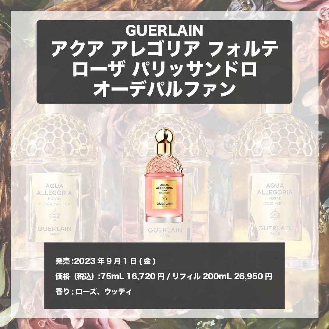 . 『ゲラン 新作香水』 🌳製品情報🌳 GUERLAIN アクア アレゴリア フォルテ ローザ パリッサンドロ オーデパルファン 発売:2023年9月1日(金) 価格(税込):75mL 16,720円/リフィル200mL 26,950円 香り:ローズ、ウッディ 🌳コメント🌳 ・レモンやコリアンダー、ベルガモットの果皮のフレッシュかつスパイシーなファセットに、繊細なハニーアロマを放つターキッシュローズアブソリュートを重ね、ローズウッドの華やかなフローラルノートを際立たせた。ラストは、ウッディなパチョリやサンダルウッドをプラスして、深く神秘的なムードを演出している。 引用:GUERLAIN公式HP 🍃===================================🍃 #香水 #フレグランス #フレグランスミスト #フレグランスハーバリウム #プレゼントにおすすめ #プレゼント選び #プレゼントに最適 #香水好きな人と繋がりたい #香水マニア #香水好き #香りフェチ #香り好きな人と繋がりたい #香り #モテる #モテる方法 #秋の新作 #GUERLAIN #ゲラン #ローズ #ウッディ #オーデパルファン #オードパルファム #オードパルファン #eaudeparfum #フローラル