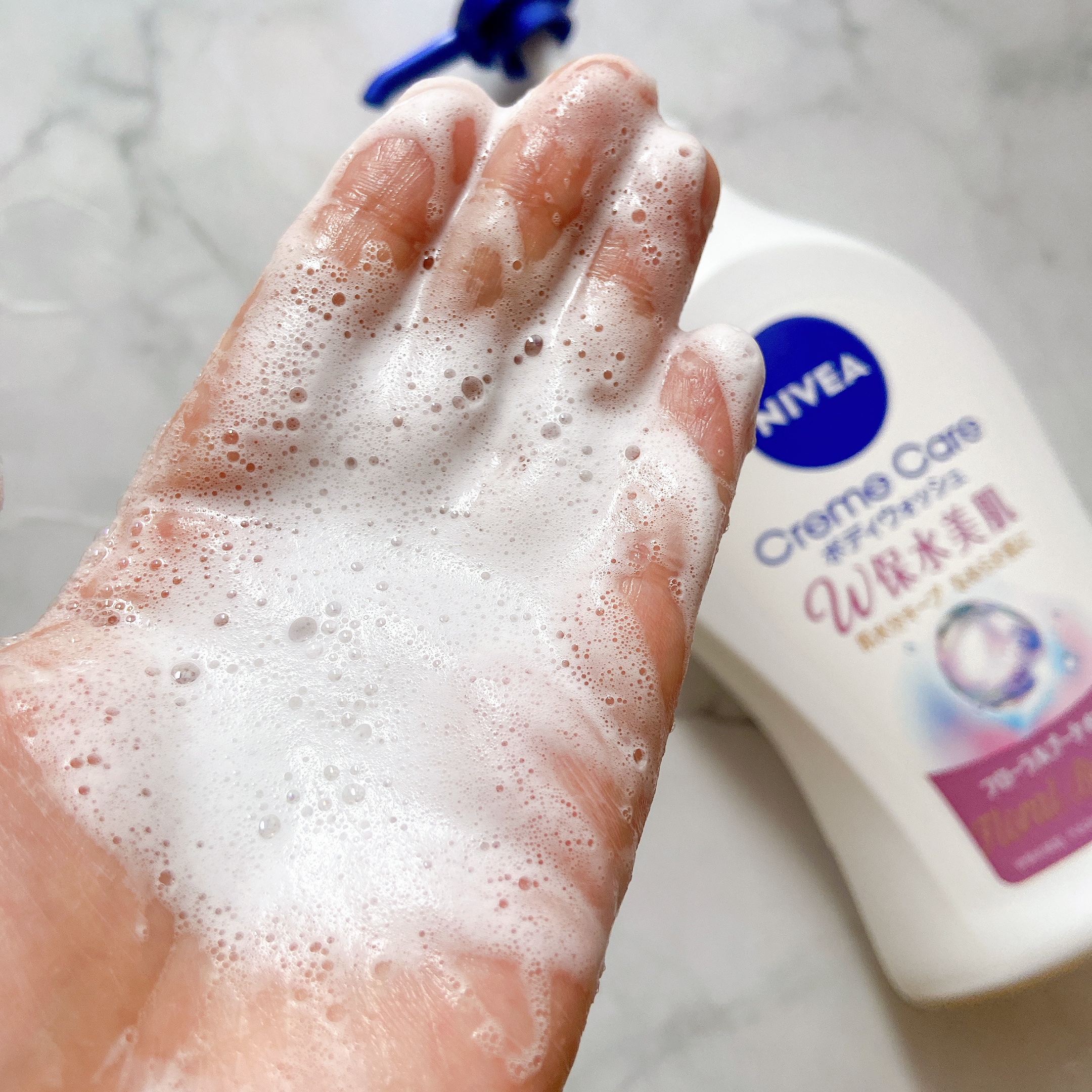 フローラルブーケは華やかさあるフローラルな香り、リラクシングソープは清楚感ある涼やかな石鹸の香り☺️ 泡立てると、少しねっとりした感じのエアリー泡に🫧 W保水美肌の「W」はヒアルロン酸とコラーゲンのこと! しっとり洗い上げてくれるボディウォッシュ✨ さすがニベアー!