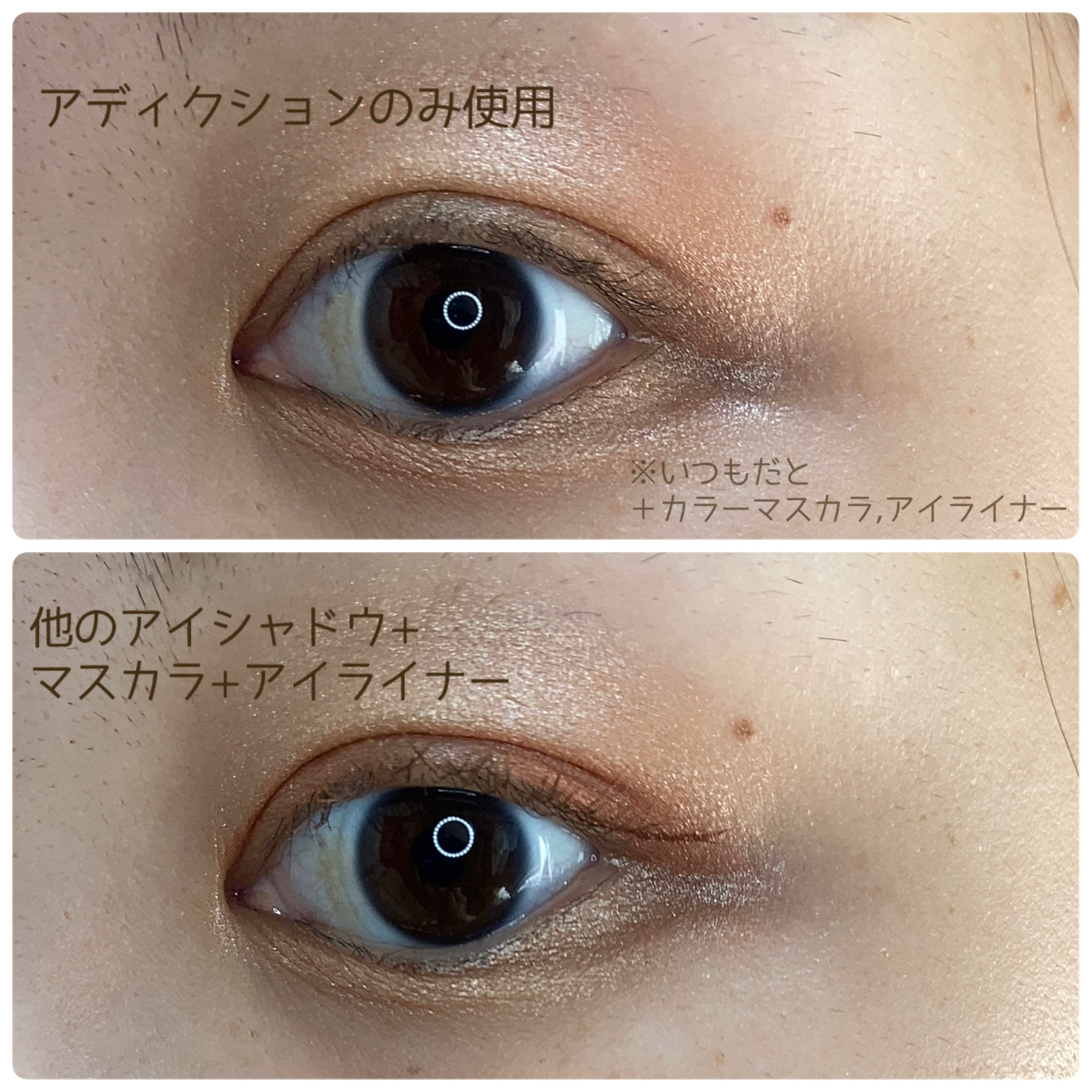 これほんとにみんな絶対1つ持っていてほしいくらいかわいい… 塗りますとね、オレンジピンクに輝くのよ… 繊細なパールですのでギラギラ感は無いですし、角度をつけた時にチラッと見える色がもうねヤバい(語彙量が皆無) アディクションのアイシャドウってパール感が絶妙だし、これだっ!っていうドンピシャの色が見つかりやすいのが魅力的だよね… カラバリも豊富ですので、気になった方は是非チェックしてみて下さい!