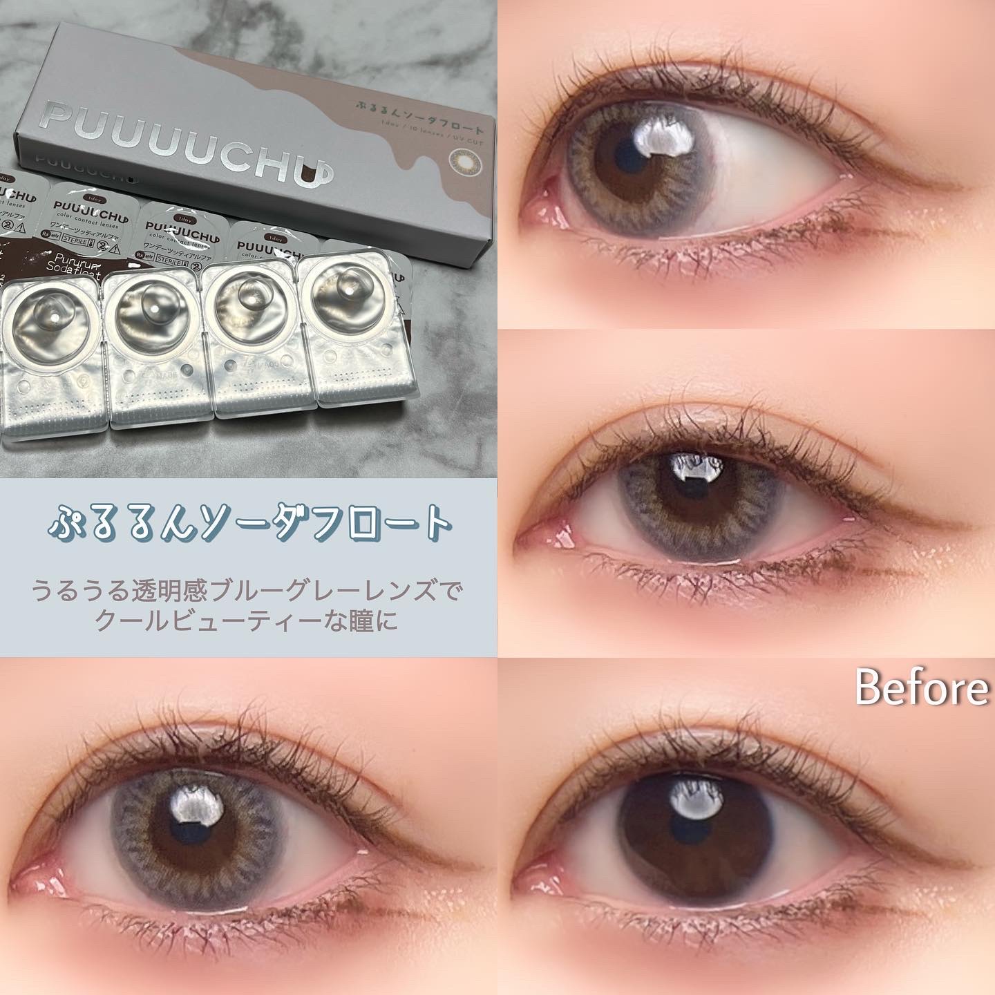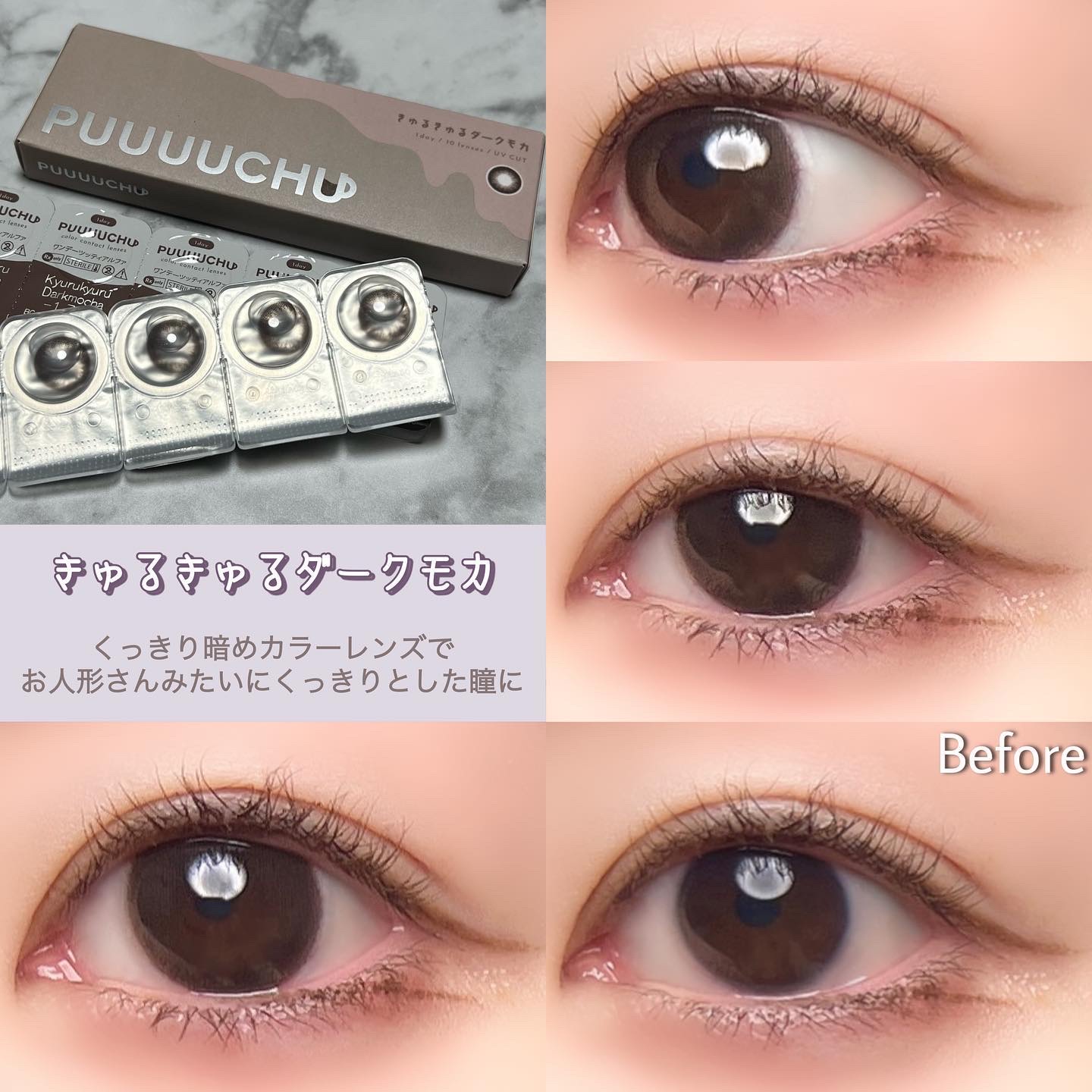 - ※2023年7月よりパッケージ底面カラー名表記部分、順次リニューアル。尚、これに係る商品の返品・交換等は承っておりません。 女の子の「かわいい」がぜーんぶ叶うよくばりなラインナップ 絶対ばぶフェイス♡ちゅるんチョコフラッペ DIA14.2mm/着色直径13.5mm 細フチ×ピュアベージュ ピュアちゅるんレンズで守りたくなっちゃうような甘めの瞳に 王道人類モテ♡ふわふわカプチーノ DIA14.5mm/着色直径13.7mm ぽんわりフチ×ふわブラウン フチふんわりシフォンブラウンレンズで優し気な瞳に 超絶盛れ地雷女子♡きゅるきゅるダークモカ DIA14.5mm/着色直径13.8mm 溶け込みグラデ×きゅるんブラック くっきり暗めカラーレンズでお人形さんみたいにくっきりとした印象の瞳に 韓国系クール美人♡ぷるるんソーダフロート DIA14.2mm/着色直径13.2mm うるうる質感×透明感ブルー うるうる透明感ブルーグレーレンズでクールビューティーな瞳に 商品名 :PUUUUCHU(プーチュ) 価格 :1,650円 税込(10枚入り) カラー :全4色 レンズ :BC8.6mm DIA14.2mm/14.5mm UVカット 含水率 :38% 使用期間 :終日装用、一日交換 度数 :0.00D(度なし),-0.50D~-6.00D(0.25D刻み),-6.50D~-10.00D(0.50D刻み) 販売名 :ワンデーツッティアルファ 承認番号 :22400BZX00427000 カラーコンタクトレンズの不適正使用による眼障害の危険性等などがあります。 ●コンタクトレンズは高度管理医療機器です。不十分な洗浄・消毒など不適切なケアや、長時間・交換期間を超えた装用により、アレルギー性結膜炎、角膜感染症、角膜潰瘍等の重篤な眼障害が発生する危険性があります ●ご使用前に取扱説明書を確認してください 使用上の留意事項 ●眼科医院等を受診してからお求めください ●眼に異常を感じたら直ちにレンズ使用を中止し、お近くの眼科等で診察を受けてください ●医師の指示にしたがってご使用ください ●コンタクトレンズを装用する場合、自覚症状がなくても、眼科医院等での定期検査を受けてください ●レンズに不具合がある場合は使用しないでください