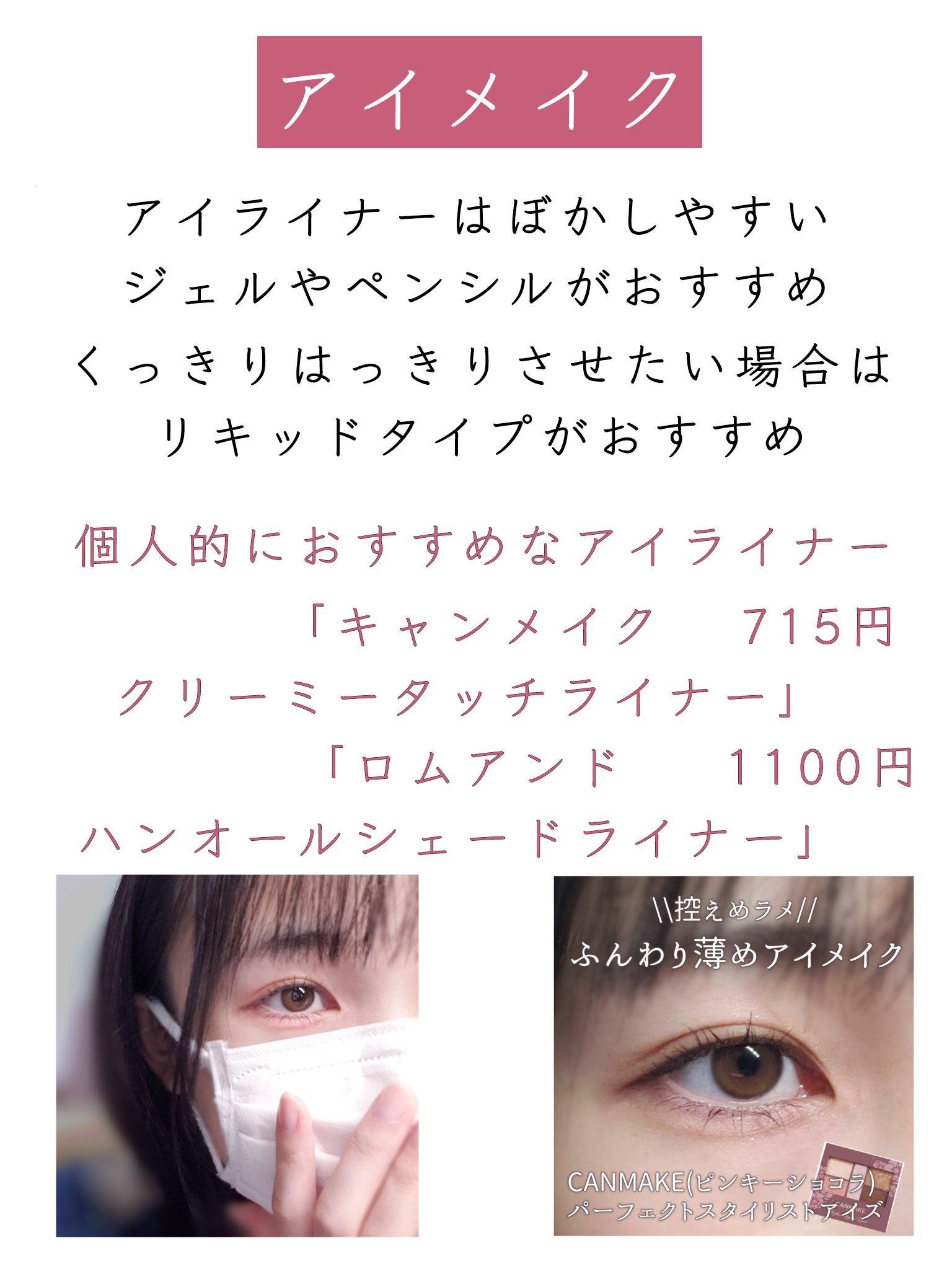 「キャンメイククリーミータッチライナー03ダークブラウン」 アイラインを描く。 「09ダージリンピンク」 オーバーラインと目頭切開ラインを描く。 「BLEND BERRYオーラクリエイション102ザクロ&シュガリーピンク」 右上の薄ピンクをアイホールと涙袋に塗る。(アイラインをぼかしながら) 右下の茶色を目尻に塗る。 「CEZANNE描くふたえアイライナー」 涙袋の影を描く。二重の線をなぞって二重の堀を深くする。 オーバーラインをなぞる。 「PERIPERAシュガー トゥインクル リキッド グリッター02SODAPOP FLAKES」 涙袋と目頭、アイホールの中央に塗る。(アイホールの中央はぼかす) 「キャンメイククイックラッシュカーラー透明タイプ」 まつ毛をしっかりあげてから塗る。爪で軽くつまみ束を作る。 「MAJOLICA MAJORCAラッシュエキスパンダー ロングロングロング EXOR505ヴィンテージオレンジ 歩幅」 毛先に塗り、指で整えて完成。(塗りすぎるとまつ毛の存在感が消えてしまうため塗りすぎ注意)