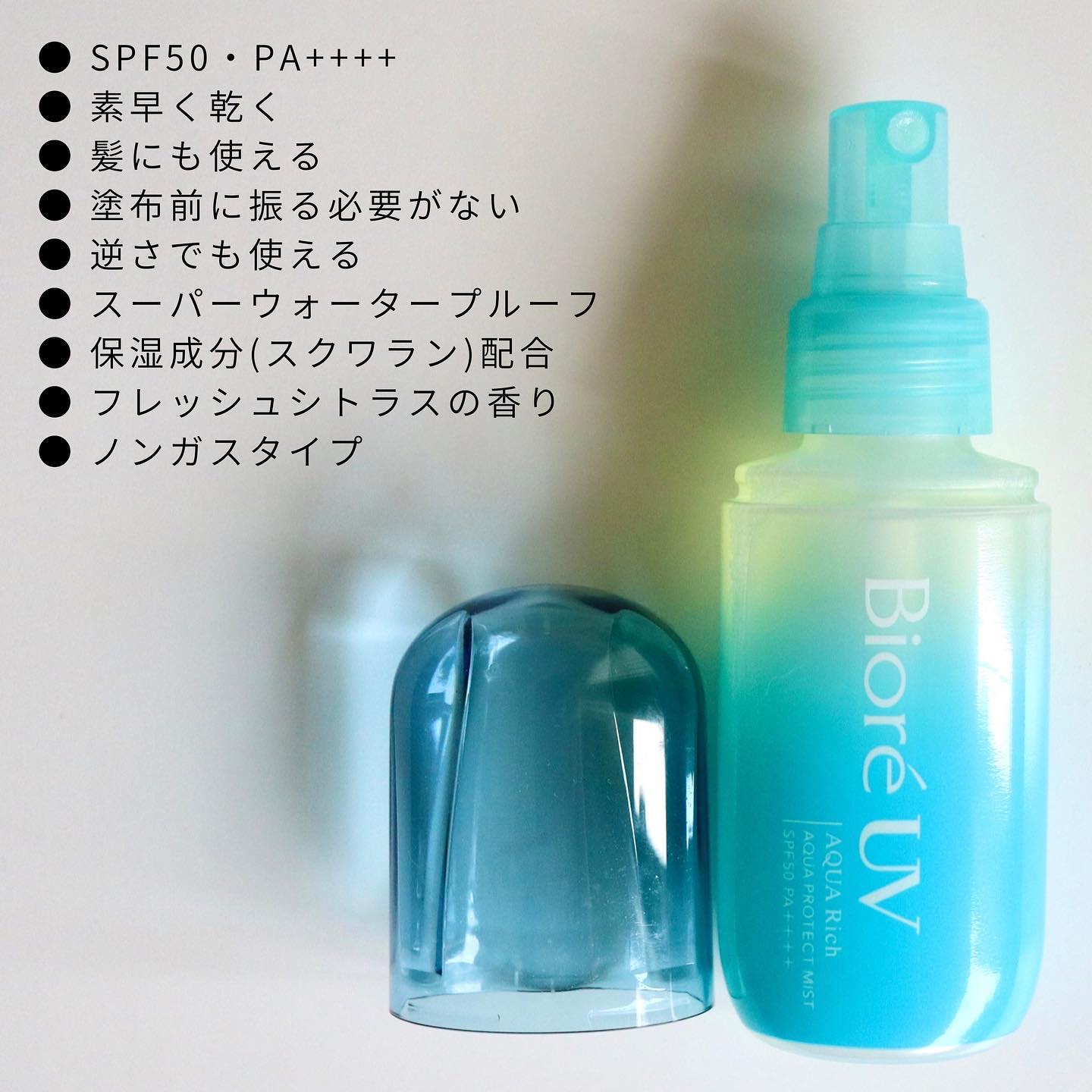 - 「しゅっ」→「ぴたっ」浴びる霧!?からのムラなく密着!いつでもどこでも速攻プロテクトで濡れつや肌続く!瞬感ミストUV。SPF50 PA++++、スーパーウォータープルーフ(80分間の耐水試験で確認済み)。顔・からだ用日やけ止め(髪にも使える)。素早くなじんで、白浮きしない。浴びるたび素肌のうるおい守る。スクワラン配合(保湿成分)。せっけんで落とせる。