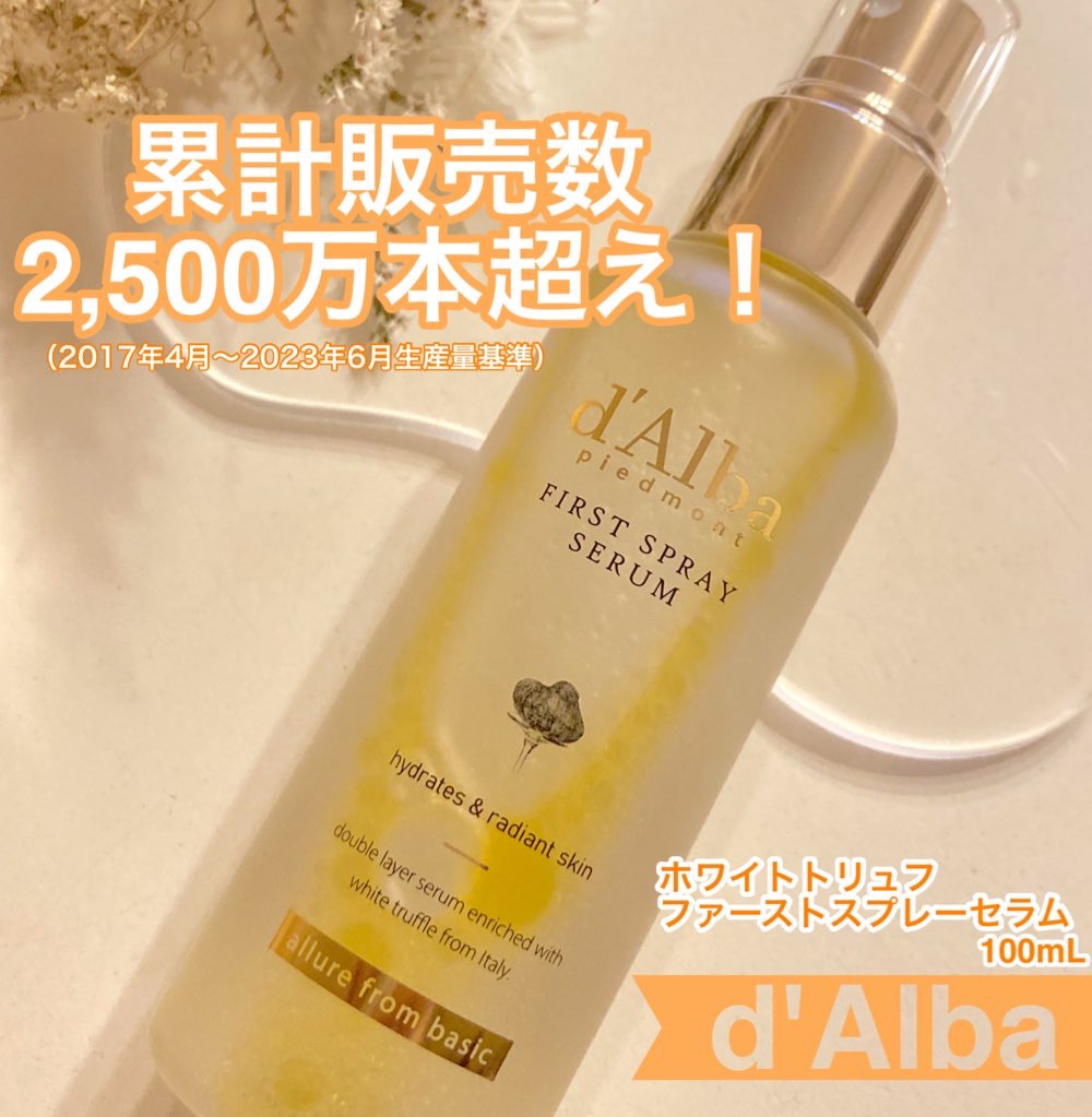 d'Albaの代名詞とも言える、セラムミスト。 韓国のCAさん達が愛用している事から、今では“CAミスト”と呼ばれて親しまれているみたいですね🩷 全世界累計販売量4,200万本 ・韓国オリーブヤング ミストセラムランキング1位 ・@cosme ミストカテゴリランキング1位 (2024年11月1日基準) 黄色のホワイトトリュフファーストスプレーセラムは保湿力があるので乾燥肌さんに特にオススメしたい✨ メイク後に顔に吹き付けるとツヤ感をプラスしてくれます💕