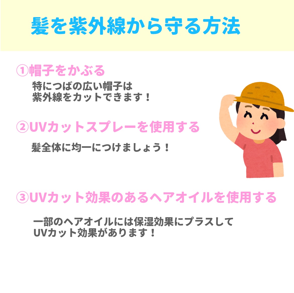 日焼け対策の基本をまとめました美白や透明感のためだけでなく、健康でいるためにも日焼け対策は大切です! ①毎日日焼け止めを塗ろう!アネッサとビオレUVジェルおすすめです! ②日傘をさそう!焼けないし涼しいし一石二鳥! ③ビタミンCを摂ろう!わたしはDHCのハードカプセルのビタミンCがおすすめです! ④よく寝よう!ターンオーバーだいじですお肌を休めてあげましょう