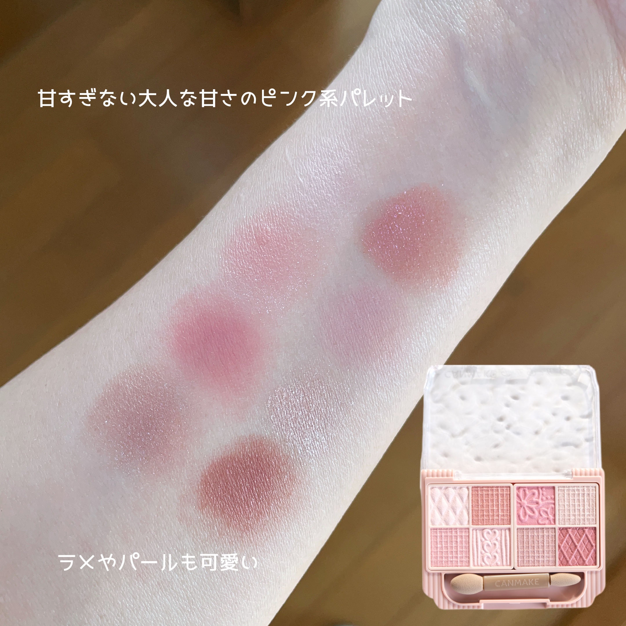 今回は新処方なベルベットな質感。 高発色、かつ軽い付け心地が特徴の新作となっております☺️ ベルベット質感はパレットの下2色で、他マットとサテンのMIX✨ 肌なじみのいいパステルピンクが可愛くてグラデーションも美しい🤤 粉質はしっとりやわらかくふわっとした付け心地。どの色も可愛いくて色んなパターンでメイクできそう✨