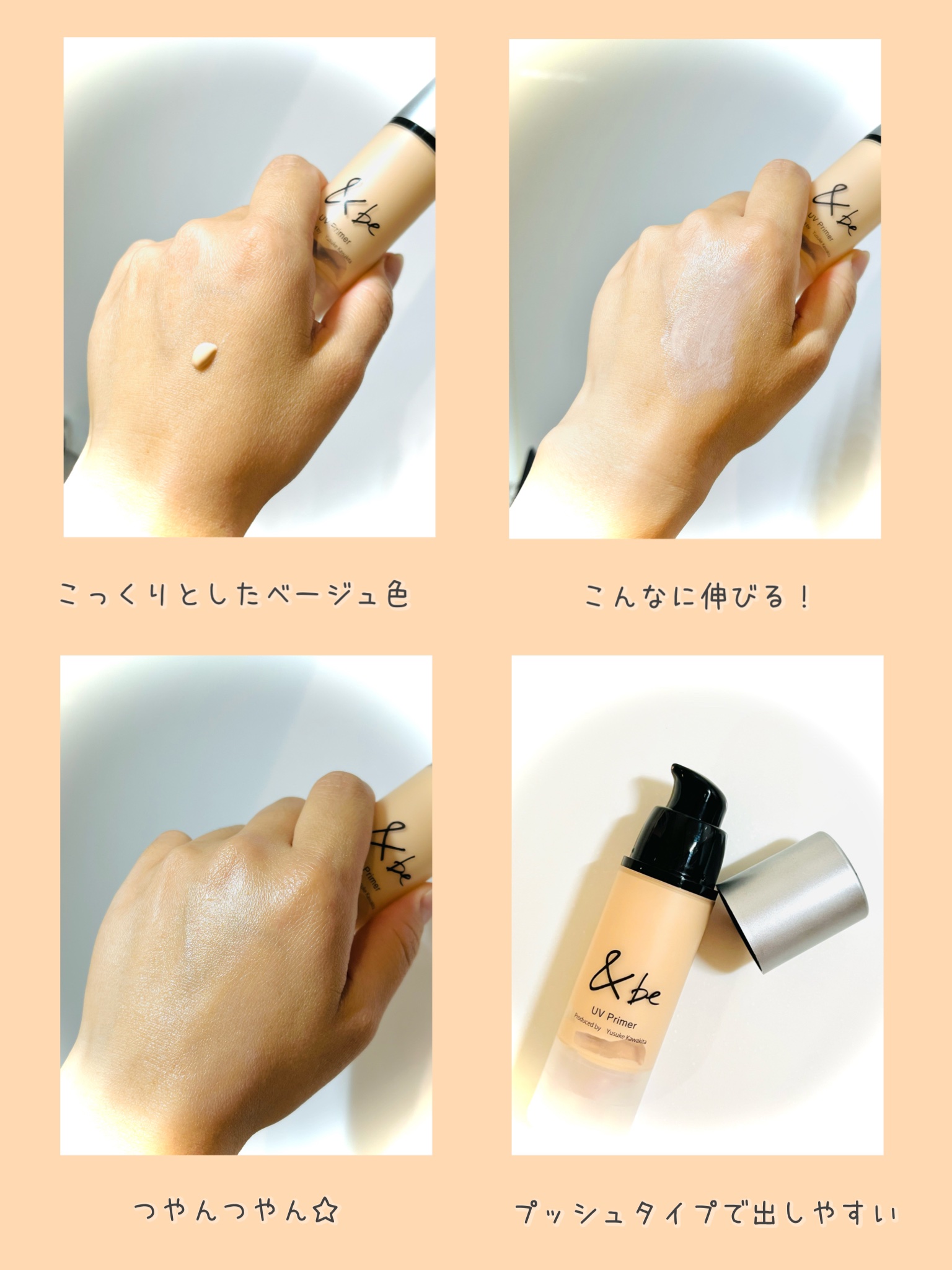 最近ノーファンデをはじめたお友達の肌がすごくキレイで。日焼け止めとか何使ってるのか聞いたらこれだよって教えてくれたので、さっそく私も使い始めました♡ &be(アンドビー)「UVプライマー」下地なんだけど、カバー力が高めでとにかくツヤがキレイ。肌にみずみずしい透明感を与える微細パールが高配合されてるんだそう。 SPF50+・PA++++と高い紫外線カット効果をノンケミカル処方で実現。鉱物油、紫外線吸収剤、石油系界面活性剤、タール系色素、合成香料不使用のフリー処方で、石鹸オフできるのも嬉しいポイント。
