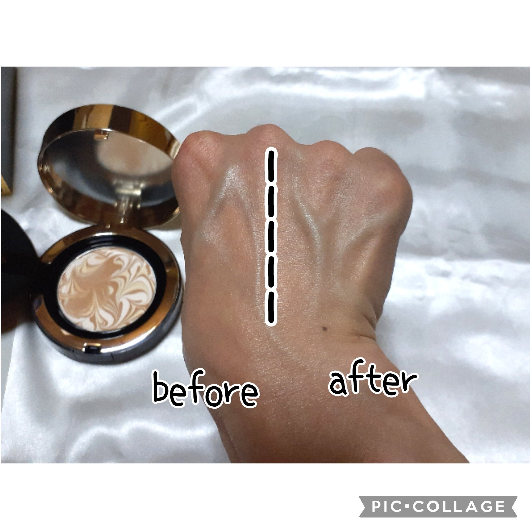 パフで出した時は3色分かれて出てくるけど、肌に乗せると混ざり合って透明感が出ます。 付属のブラシで使ってみたら均一に、透明感のあるサラサラとしたお肌になりました。 ブラシの時は、本体は少し斜めにして粉を出してました。肌に乗せるとナチュラルにツヤッとした感じがいいなと思います。