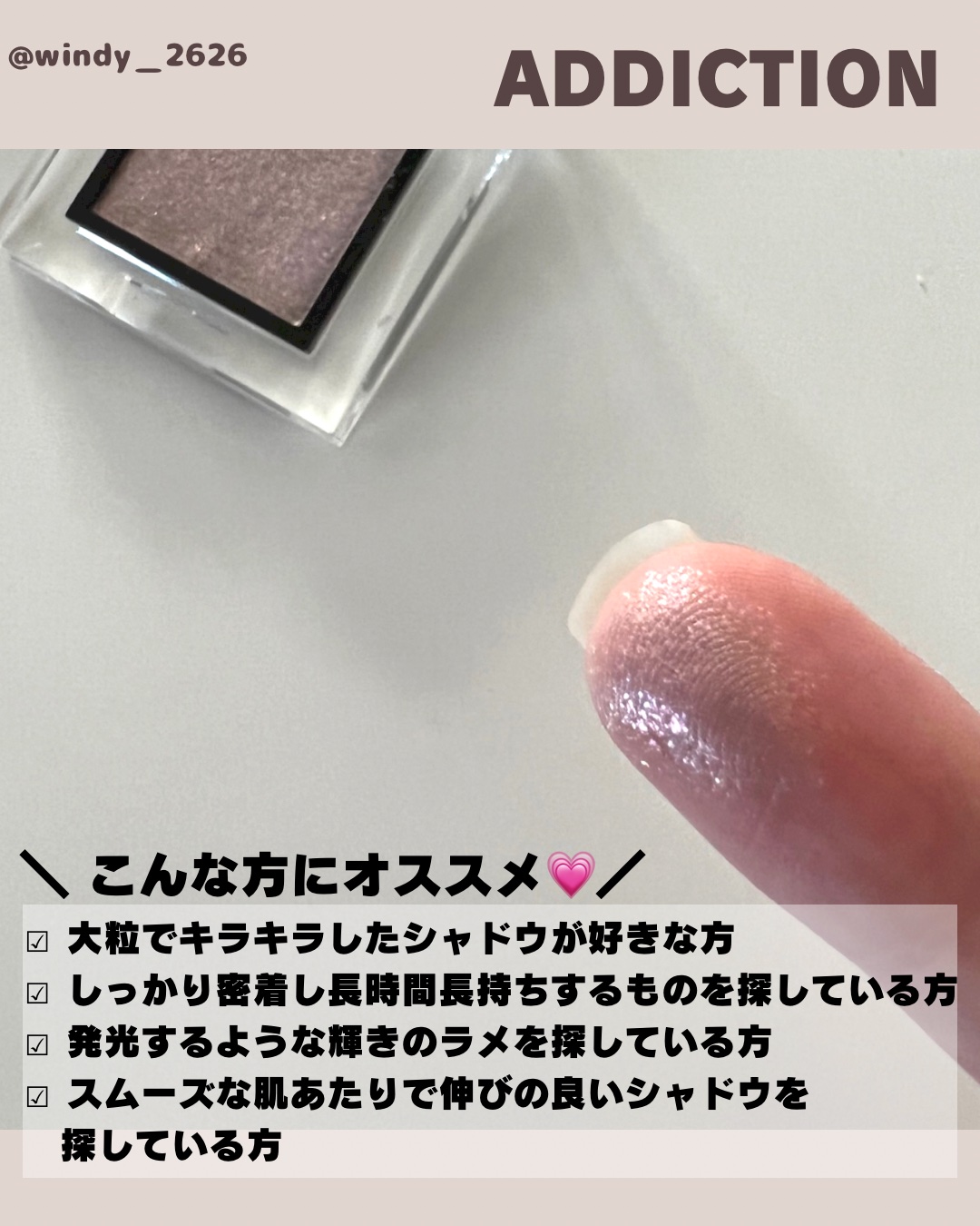 グレーベースに大粒のピンクラメが際立って可愛い単色アイシャドウ。 透明感があるけど目立ちたい目元を作りたい時‥マットなアイシャドウに重ねて使う時‥ しっとりとしたジェルのような質感なので、粉飛びやラメ飛びがしにくく、密着力が高いです。